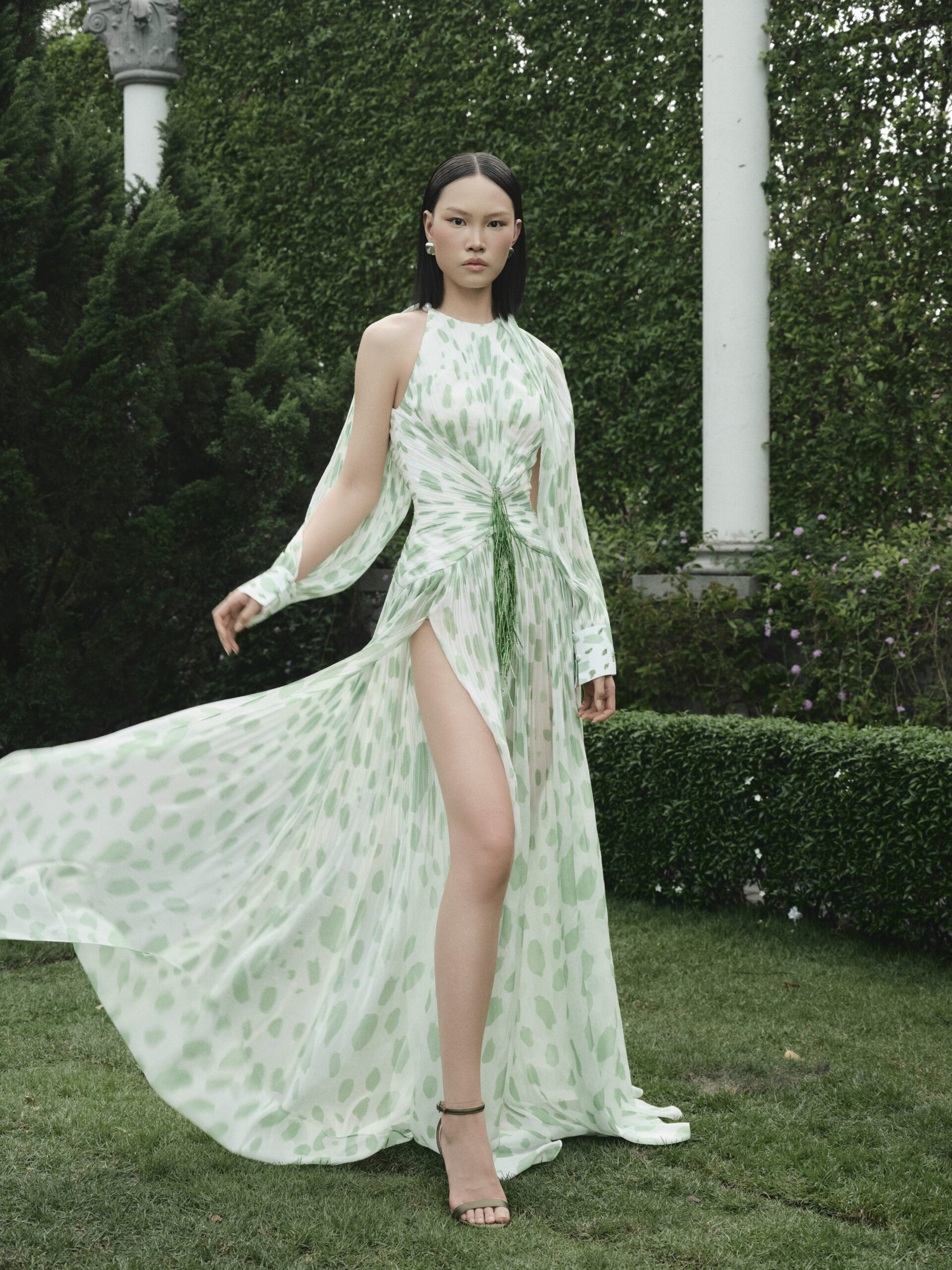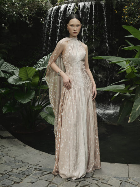 Bên cạnh đó, kỹ thuật draping và xếp nếp thủ công giúp trang phục chuyển động uyển chuyển theo từng bước đi, trong khi các lớp layer chất liệu xuyên thấu được xử lý khéo léo để tạo nên hiệu ứng thị giác đa tầng. Tất cả hòa quyện, nâng tầm giá trị thẩm mỹ của thiết kế và khẳng định đẳng cấp của thời trang cao cấp.