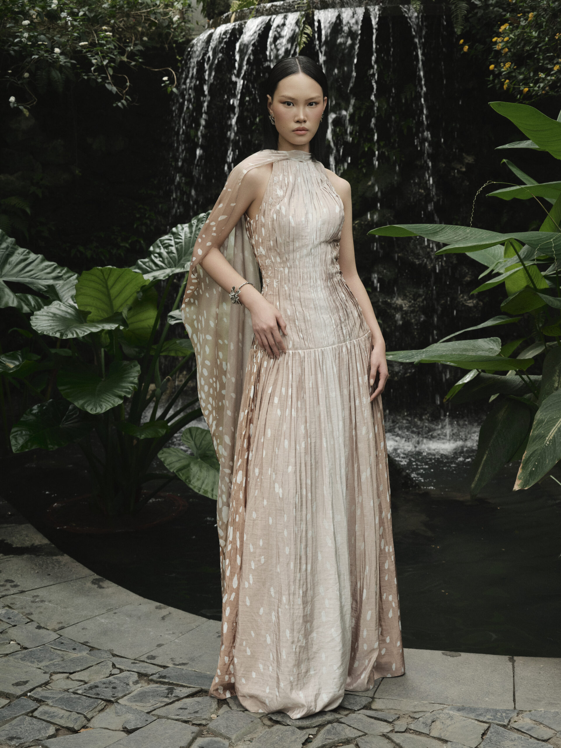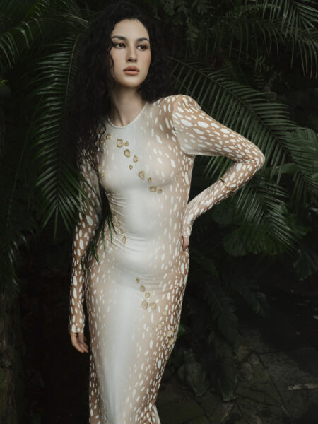 Điểm nhấn của BST Ivory Savannah nằm ở cách các họa tiết da thú được tái hiện một cách tinh tế và giàu tính thẩm mỹ. Hiệu ứng đốm hươu hay các pattern tự nhiên được xử lý nhẹ nhàng, kết hợp cùng bảng màu lấy cảm hứng từ thiên nhiên, tạo nên vẻ đẹp vừa quyến rũ vừa bí ẩn mà không hề phô trương.