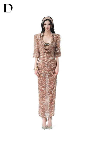 Họa tiết báo đốm được xử lý cách điệu vừa tạo điểm nhấn nổi bật, vừa giữ được nét tinh tế đặc trưng. Phần cổ yếm cùng chi tiết nhấn eo giúp tôn dáng hiệu quả, trong khi tà váy maxi dài kết hợp đường xẻ cao mang lại sự thoải mái, thanh thoát và đặc biệt phù hợp cho những chuyến đi biển, nghỉ dưỡng hay các buổi resort wear sang trọng.