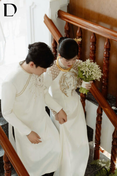 Áo dài cô dâu nổi bật với bề mặt thêu đính công phu hơn, mang đến vẻ mềm mại, trang trọng và nữ tính. Trong khi đó, áo dài chú rể được tiết chế hơn trong cách thể hiện nhưng vẫn giữ được điểm nhấn tinh xảo, giúp tổng thể trở nên hài hòa, lịch lãm và tương xứng khi xuất hiện cùng nhau. Đây là sự cân bằng quan trọng để cả hai cùng tỏa sáng trong ngày cưới mà không làm mất đi cá tính riêng.