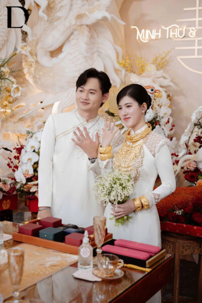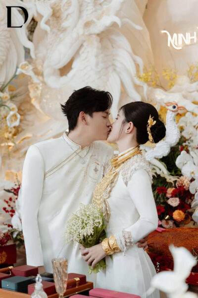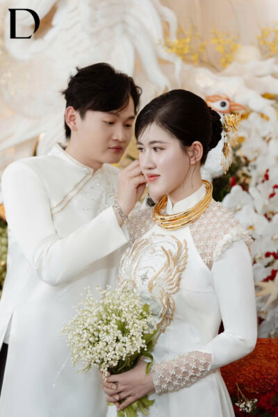 Sắc trắng trong thiết kế không tạo cảm giác đơn điệu mà ngược lại, trở thành phông nền lý tưởng để từng chi tiết thêu 3D, đính kết và họa tiết biểu tượng được hiện lên rõ nét hơn. Đây cũng là yếu tố giúp bộ áo dài giữ được vẻ thanh lịch và cao cấp, phù hợp với một lễ cưới trang trọng, nơi mọi chi tiết đều cần sự tiết chế và tinh tế.