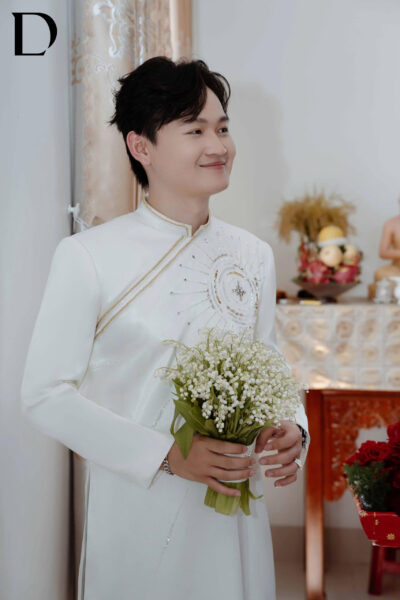 Chính sự thiết kế riêng này giúp tổng thể không chỉ đẹp về mặt hình ảnh mà còn phù hợp hơn với vóc dáng, thần thái và không khí của buổi lễ. Từ phom áo, tỷ lệ chi tiết cho đến cách đính kết, tất cả đều hướng đến việc tạo nên một diện mạo trang trọng nhưng không nặng nề, truyền thống nhưng vẫn đủ mới mẻ để ghi dấu trong những khoảnh khắc đáng nhớ nhất.