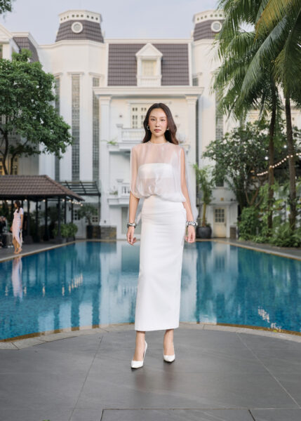 The runway opened impressively with First Face Doan Tuong Linh, who brought an alluring and captivating energy to the show. The designs from the Ivory Savannah collection were presented in an outdoor setting, where sunlight and the natural breeze enhanced the fluid beauty of materials such as voile, lace, and chiffon.