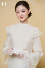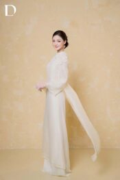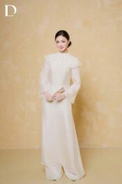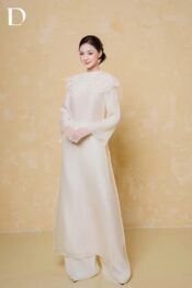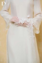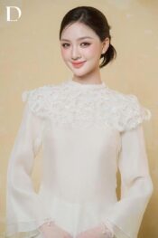 Meringue tones are treated on a base of silk combined with feathers, creating surface texture and drape with movement. Apricot blossom motifs are placed on the upper bodice as focal elements within the composition. The design explores apricot blossom imagery through material and technique, suited for springtime and Lunar New Year occasions.