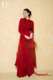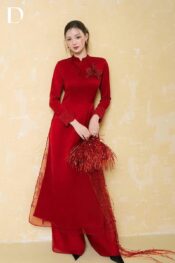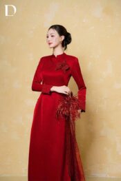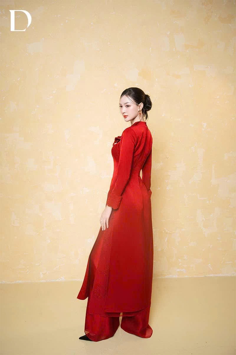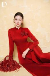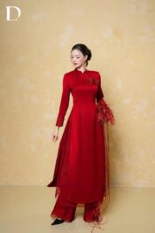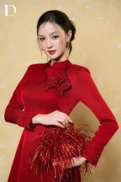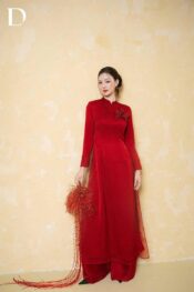 Blood Red tones are treated on a base of taffeta combined with silk, shaping the silhouette and movement. Cloud and orchid motifs are applied as focal details across the surface, defining visual composition and rhythm. Em Pháo explores Vietnamese spring imagery through color and material treatment, suited for festive and Lunar New Year occasions.