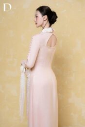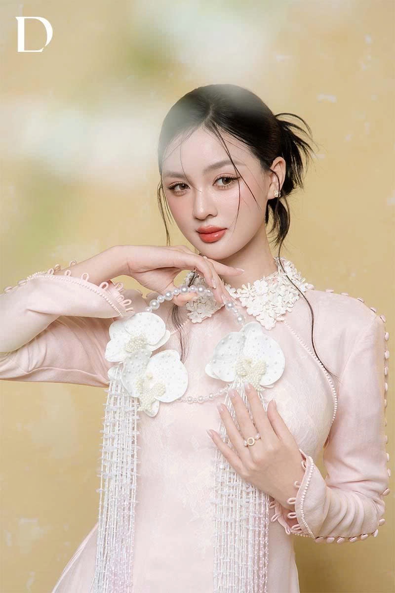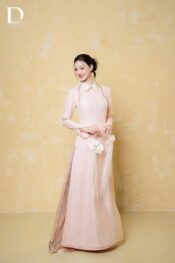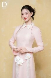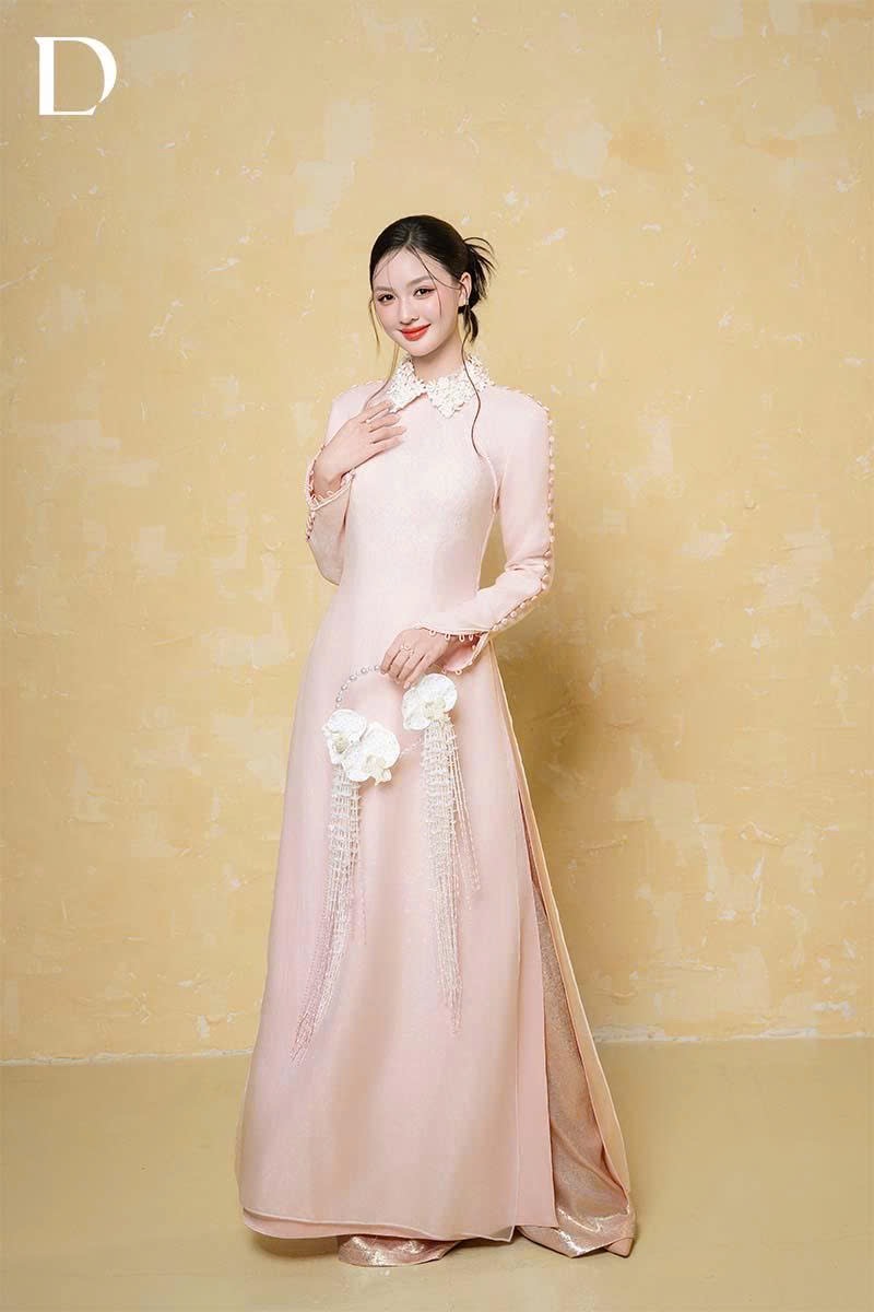 White and Petal Pink tones are treated on a base of silk taffeta combined with shimmering organza and silk, creating surface effect and depth. Floral motifs are evenly arranged across the áo dài silhouette, shaping visual rhythm through movement. The design explores spring flower imagery through material and technique within a contemporary design language.