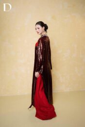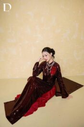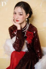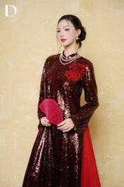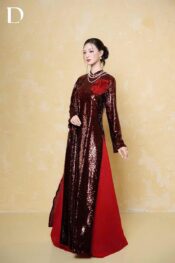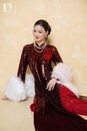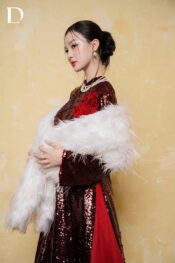Cherry Coke tones are treated on a base of crystal fabric combined with silk, creating a light-catching surface and depth. Hand-applied 3D fish embellishments are positioned as a central focal point, referencing the image of leaping over the Dragon Gate. The design explores the carp symbol through material and embellishment techniques, suited for festive occasions and the Lunar New Year season.