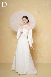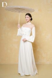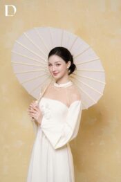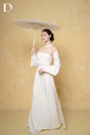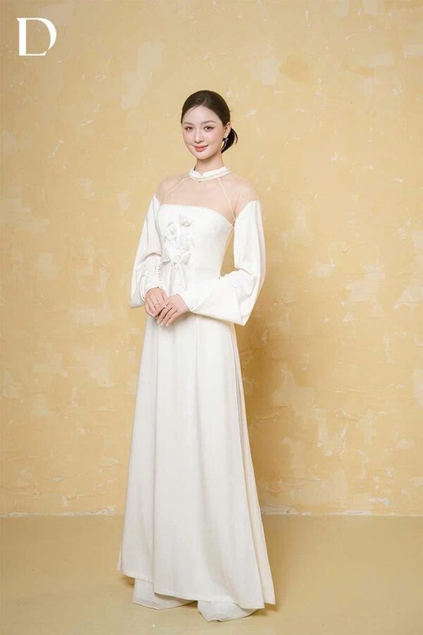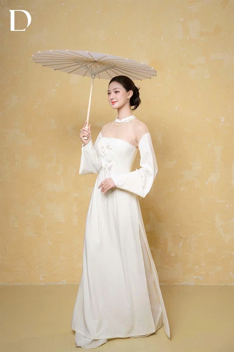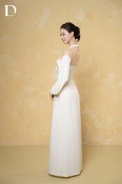 Cappuccino Foam tones are treated on a base of velvet stretch taffeta combined with mesh and silk, creating surface texture while maintaining structure. Spring bouquet motifs are placed as focal details within the design. Em Hoa explores the imagery of Vietnamese spring through color and material.
