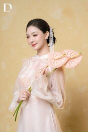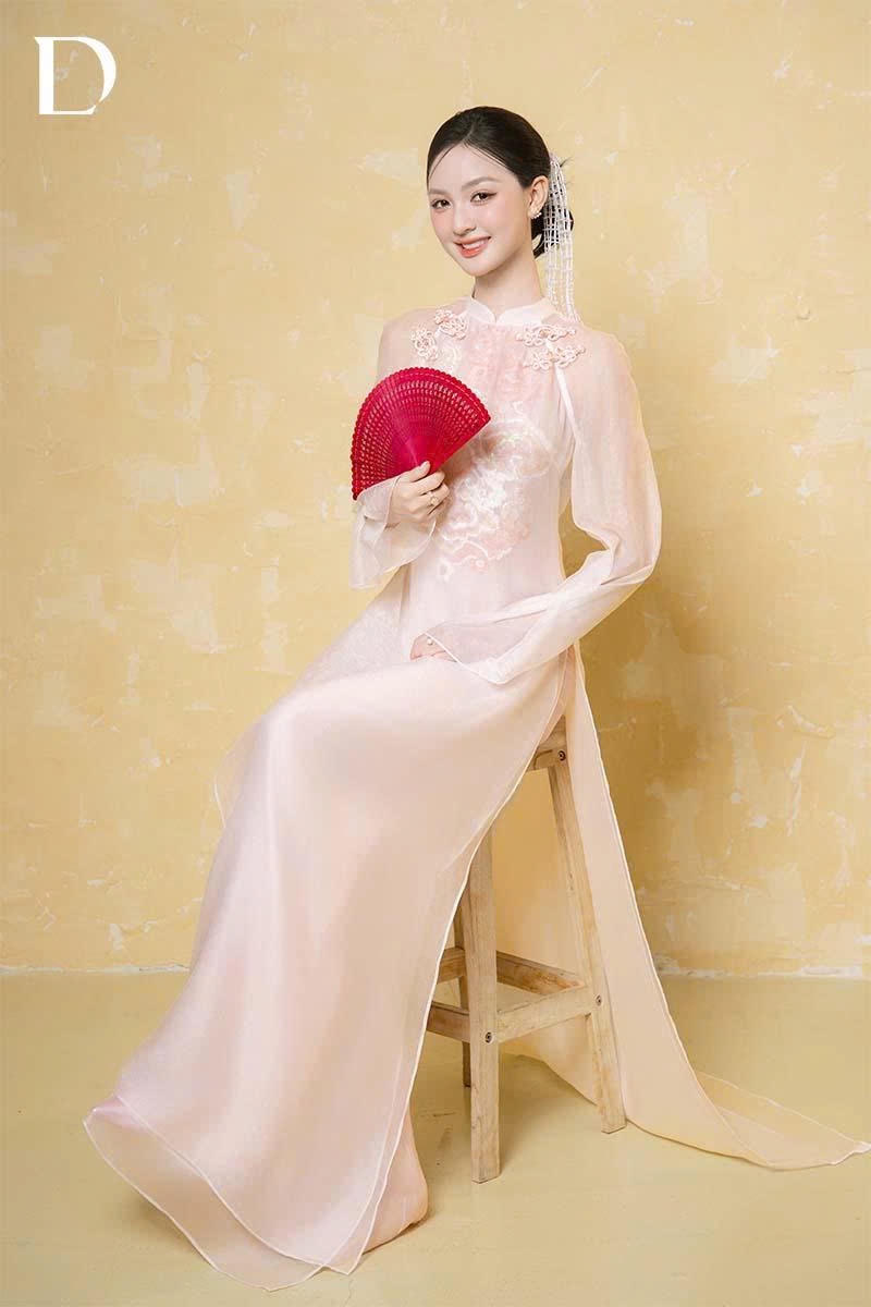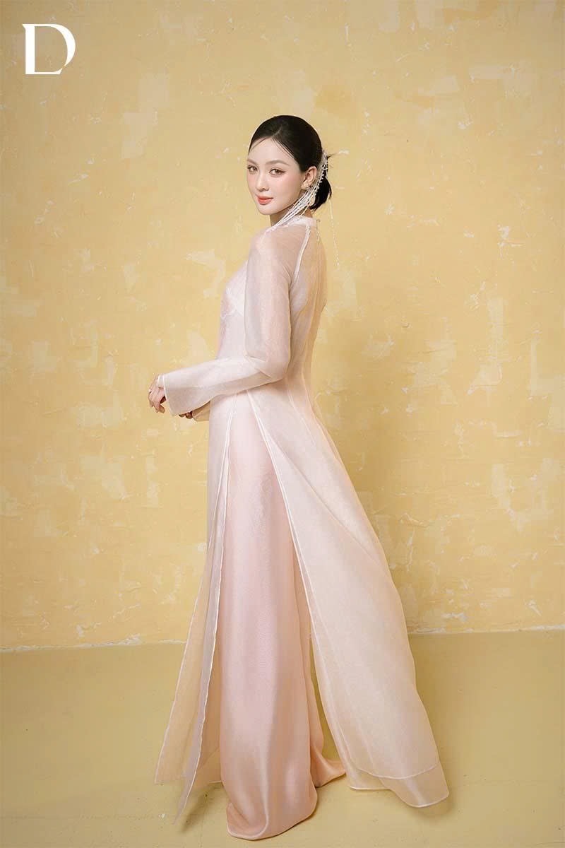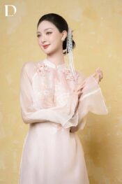 White and Mary’s Rose tones are treated on a base of shimmering organza combined with silk and crystal fabric, creating a translucent effect and fluid movement. Stylized cloud motifs are arranged across the áo dài silhouette, emphasizing drape and elongated panels. The design explores cloud imagery through a contemporary use of materials and composition.