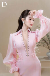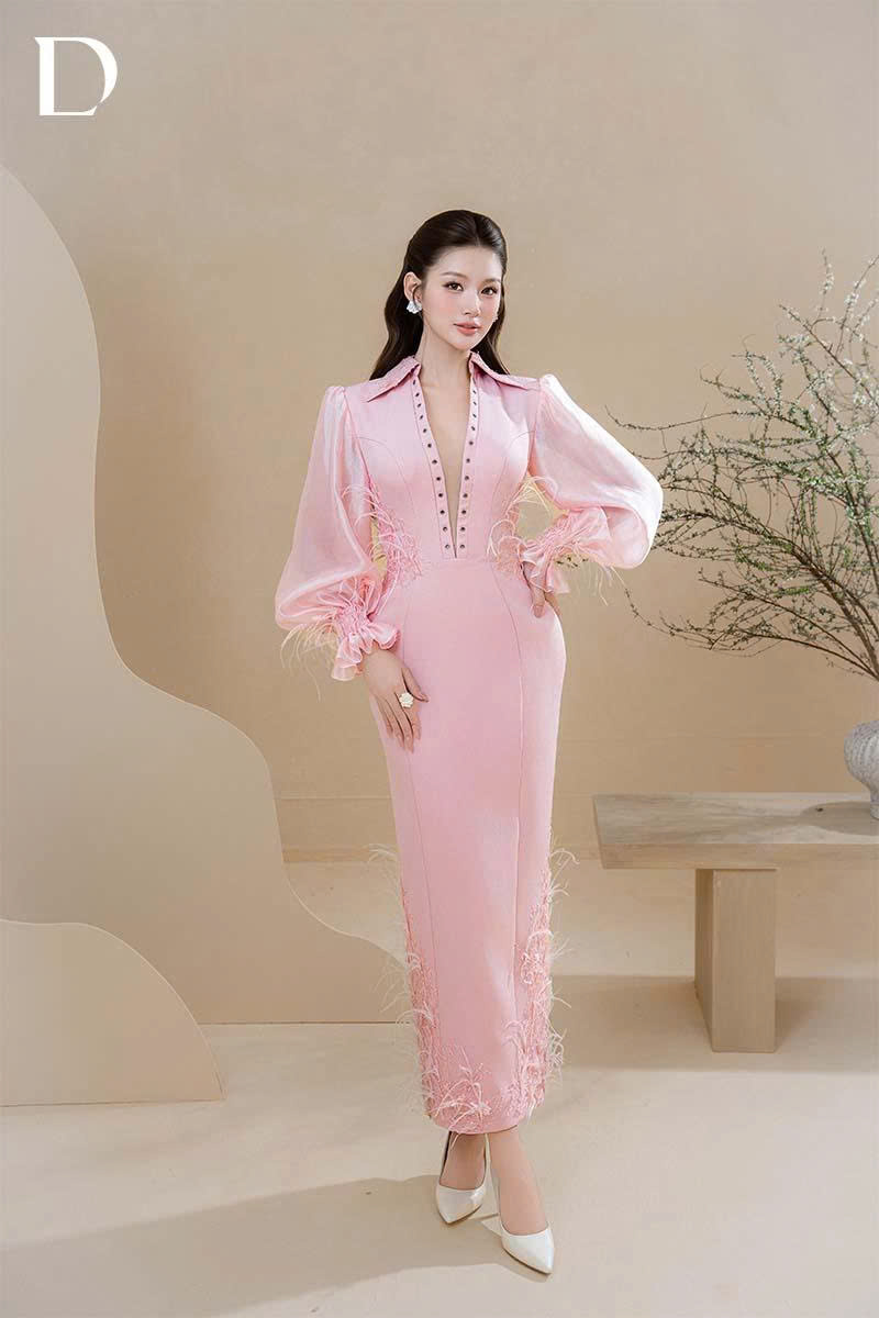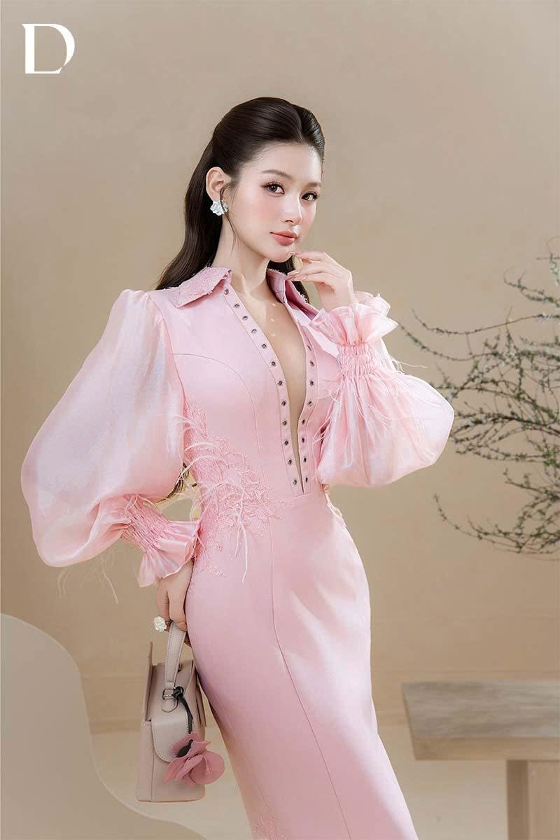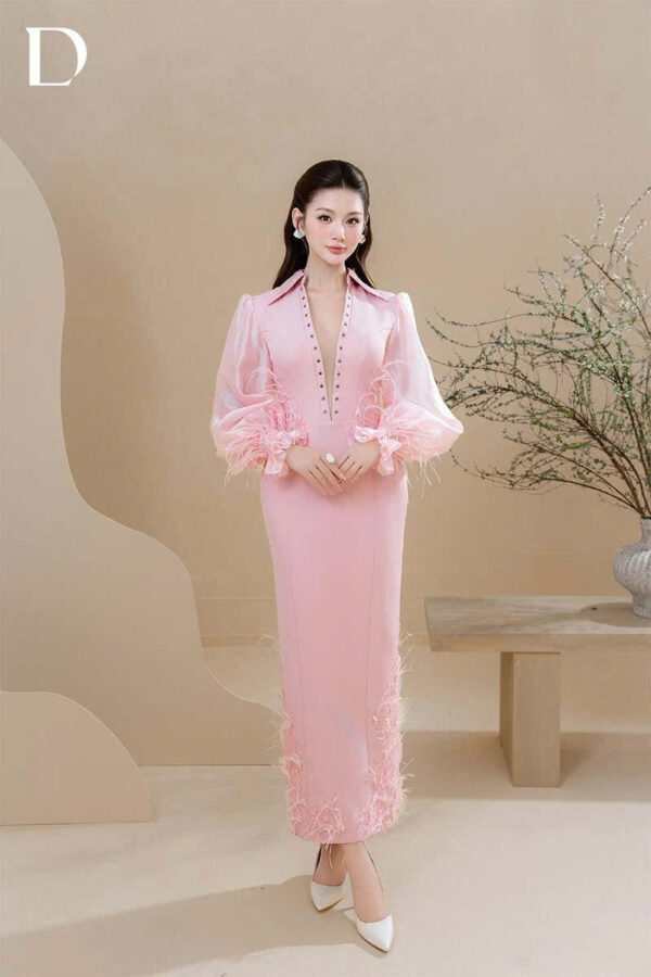 Pink long dress. A fitted silhouette on a cotton base, combined with silk and sheer mesh to create fluid drape. Lace appliqué and feather embellishments are applied at the sleeves and hem, completing the overall structure.