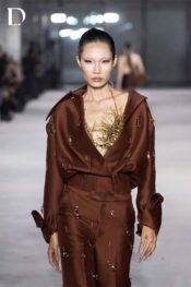 The design combines khaki fabric and mesh, creating a strong, modern silhouette. Hook-and-ring details are introduced as structural accents, adding an industrial edge. The bra is embellished with fine crystal threads, delivering a subtle shimmer that balances sharp construction with soft movement.