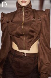 Earthbound Bloom in brown explores a raw, grounded strength. Suede and mesh create a soft surface while maintaining clear structure. The top features a cut-out waist with boning and long sleeves, accented by gathered shoulders, paired with a matching mini skirt for a modern silhouette.