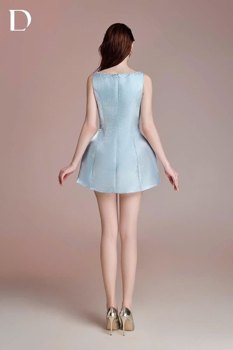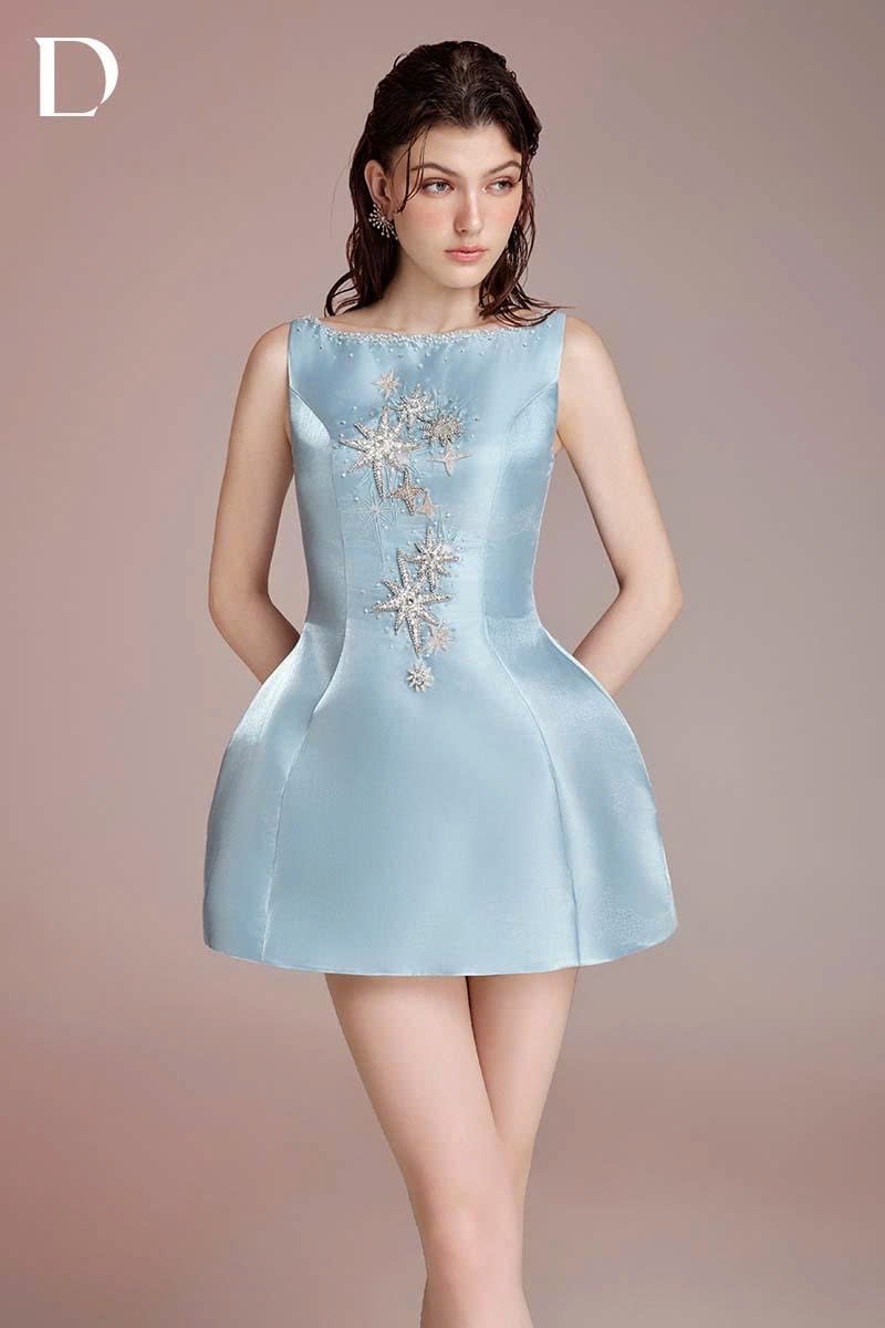 Mini dress crafted from shimmering taffeta in a blue tone. An A-line silhouette with structured volume at the hips defines proportion. Embroidered and embellished star motifs are applied across the surface, creating a light-catching effect with movement.