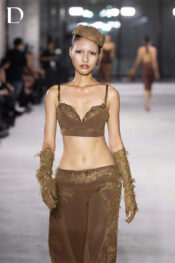 Walnut brown design. The look combines simili leather and lace to create a balanced structure. The leather-based top is paired with wide-leg leather trousers featuring cut lace and embellishment details, completing the look with clear visual depth.