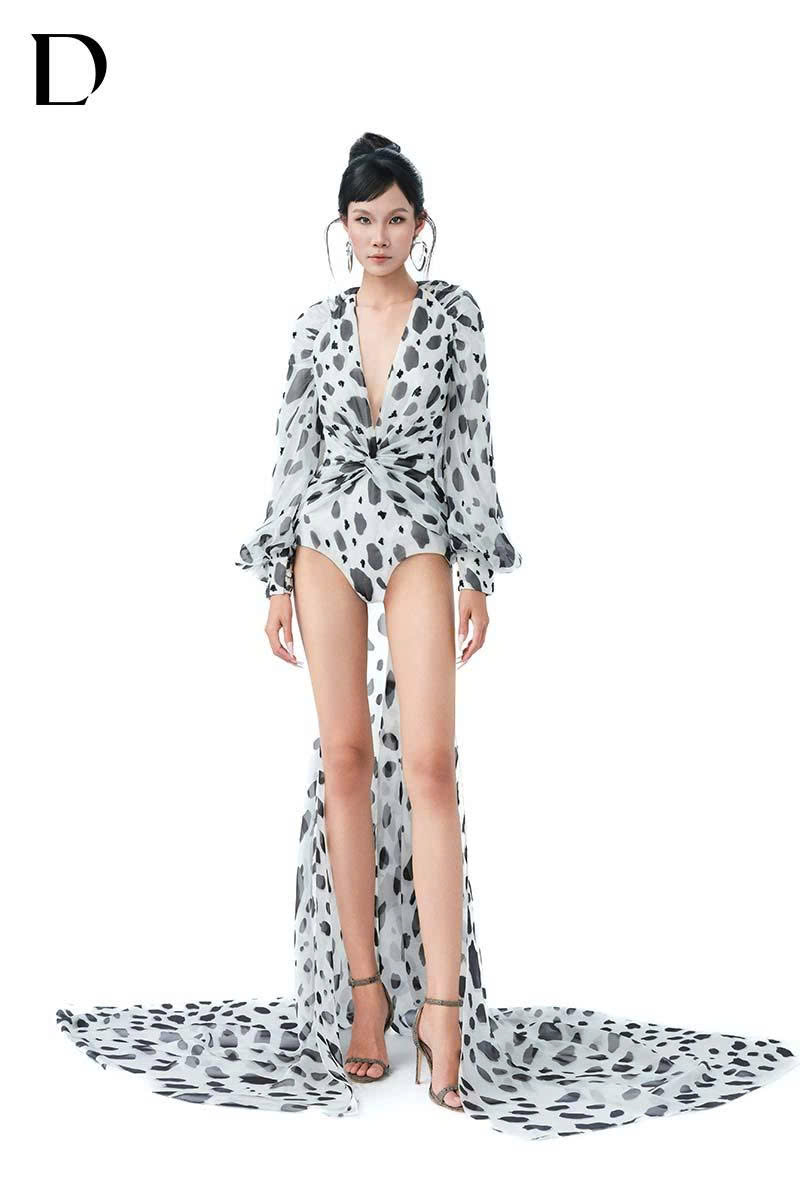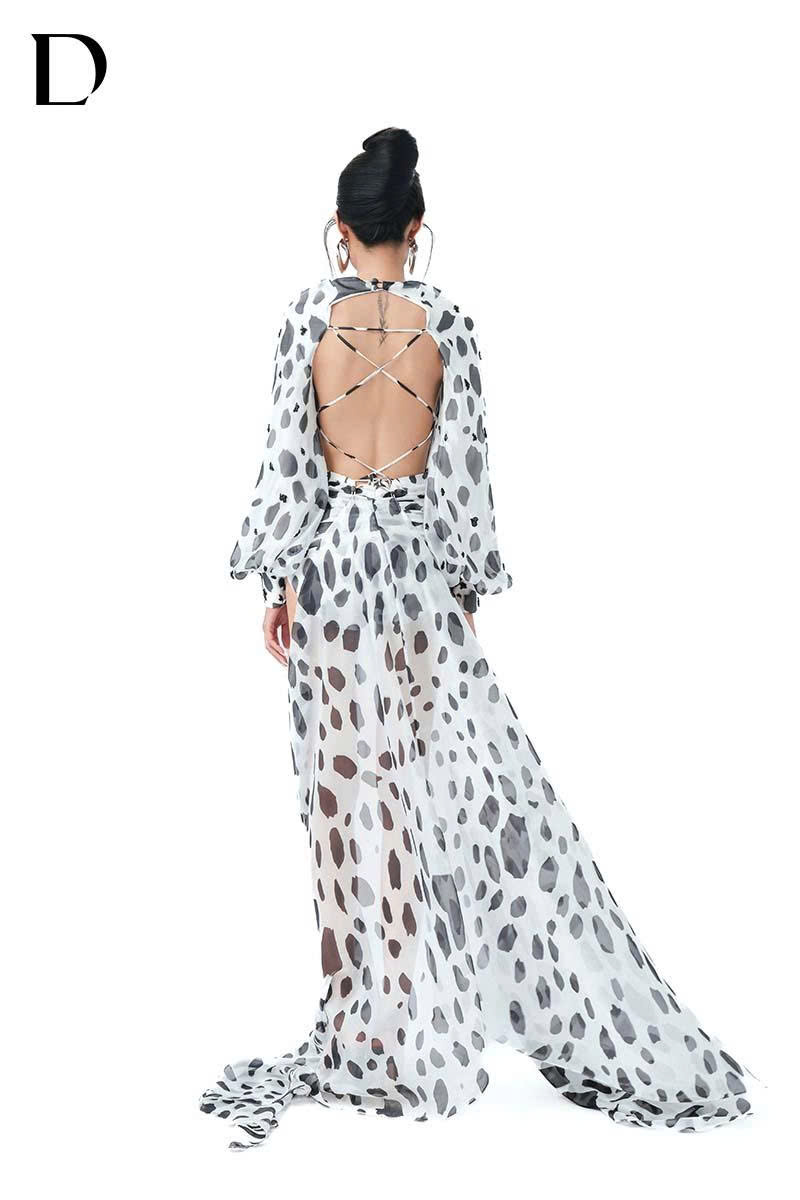Bodysuit in chiffon, in a white print. Fitted silhouette with a lace-up open back, puff sleeves, developed pattern with light embellishment.