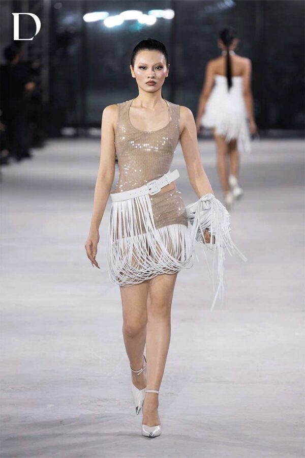 Two-tone white–nude set crafted from crystal mesh. The dress features a clean waist cut-out silhouette. Leather straps with fringe detailing are placed along the body, adding movement and visual emphasis.