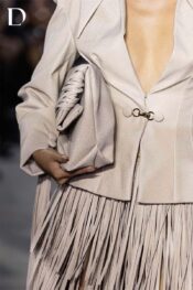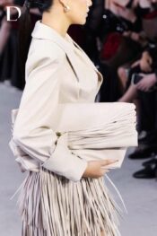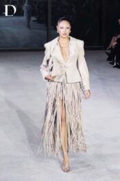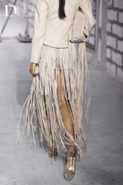 Design constructed from simili leather. The oversized vest features a deep slit with metal button detailing. A three-tier strap fringe skirt adds movement and rhythm, balancing the structure of the vest.