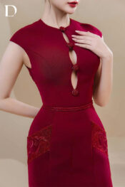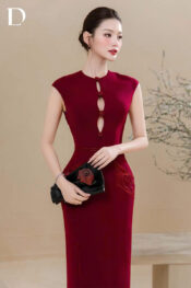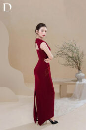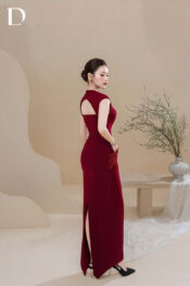Wine red long dress with a fitted silhouette, developed on a burgundy cotton base to define a clean, balanced form.