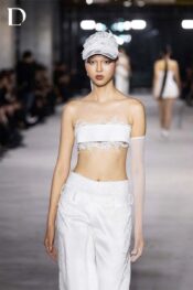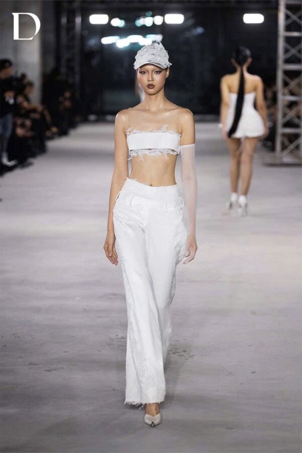 Design featuring a mesh bra with lace embellishment and a reversed belt detail at the back. Wide-leg trousers are detailed with lace running along the legs, adding movement and balance to the structure.