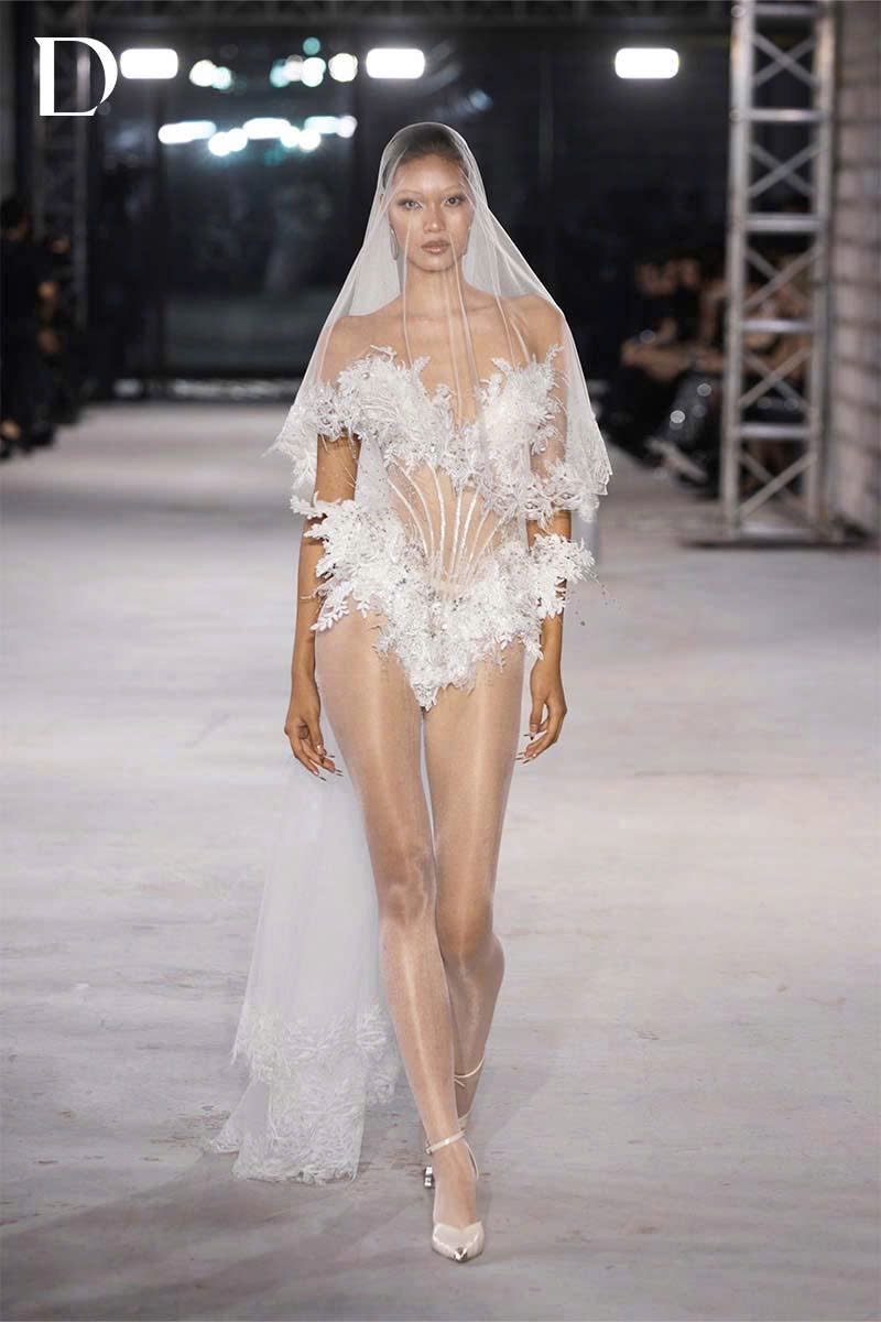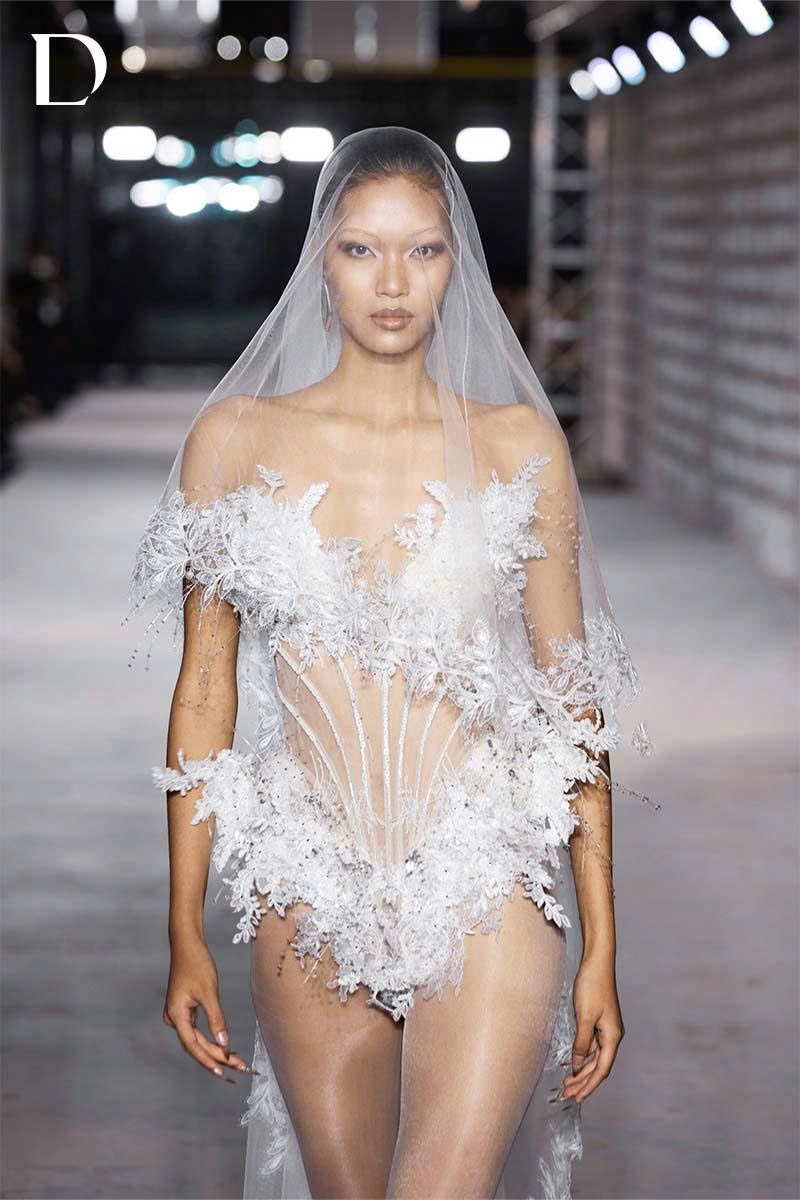 The white design is intricately crafted using lace and mesh. A sheer mesh corset structure beneath maintains a sharp silhouette while enhancing the body’s curves. The entire surface is hand-embroidered with 3D lace and embellishments, creating a soft visual effect that retains a distinctly cool, refined edge.