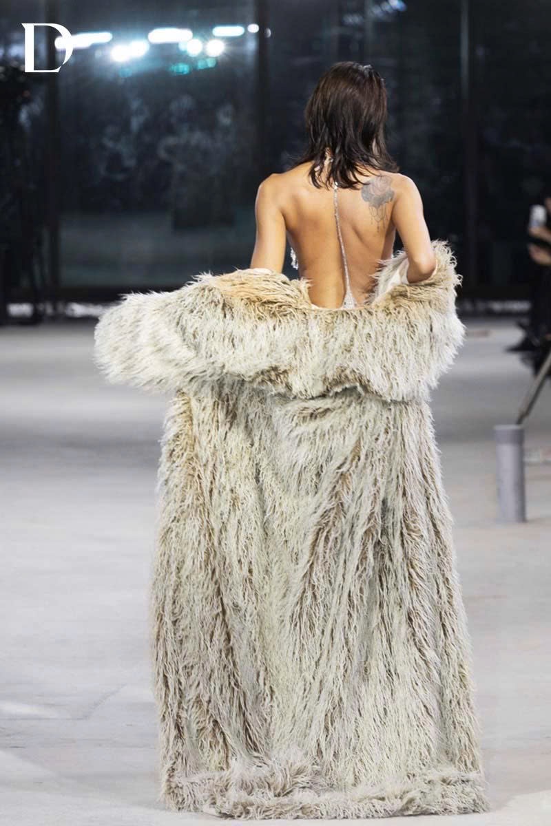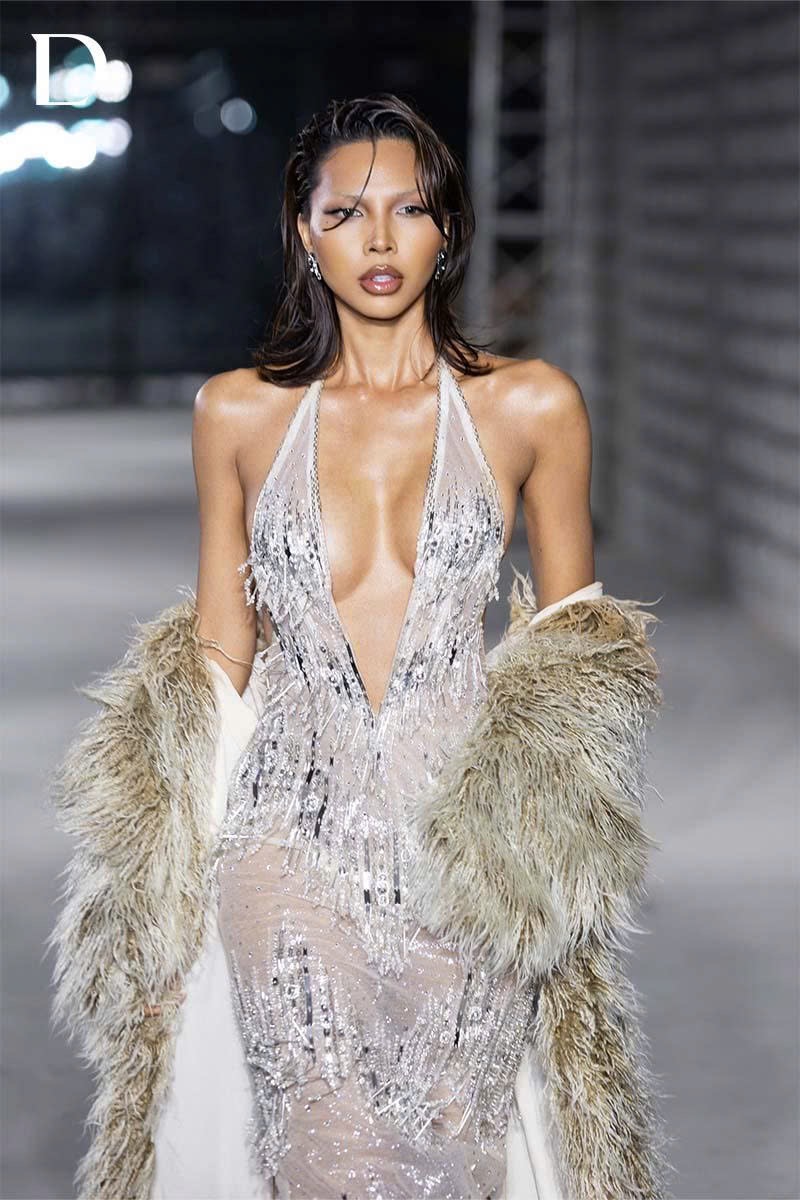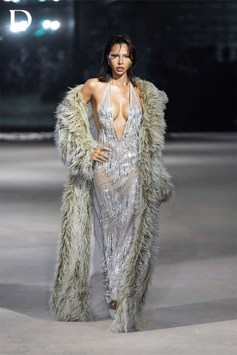 The design features a deep V-neck mesh silhouette with a sensual edge. A clean open-back cut is accented with crystal embellishment and fringe, bringing depth and dynamic movement. As the model walks, light catches on the embellished mesh, creating a captivating visual effect. The look is completed with a fur cape, adding a powerful and commanding presence.