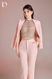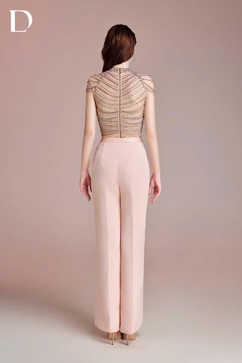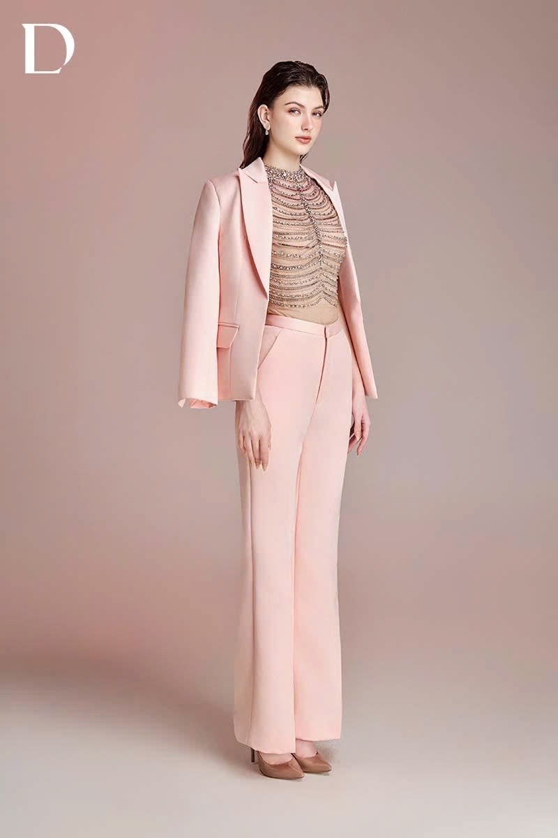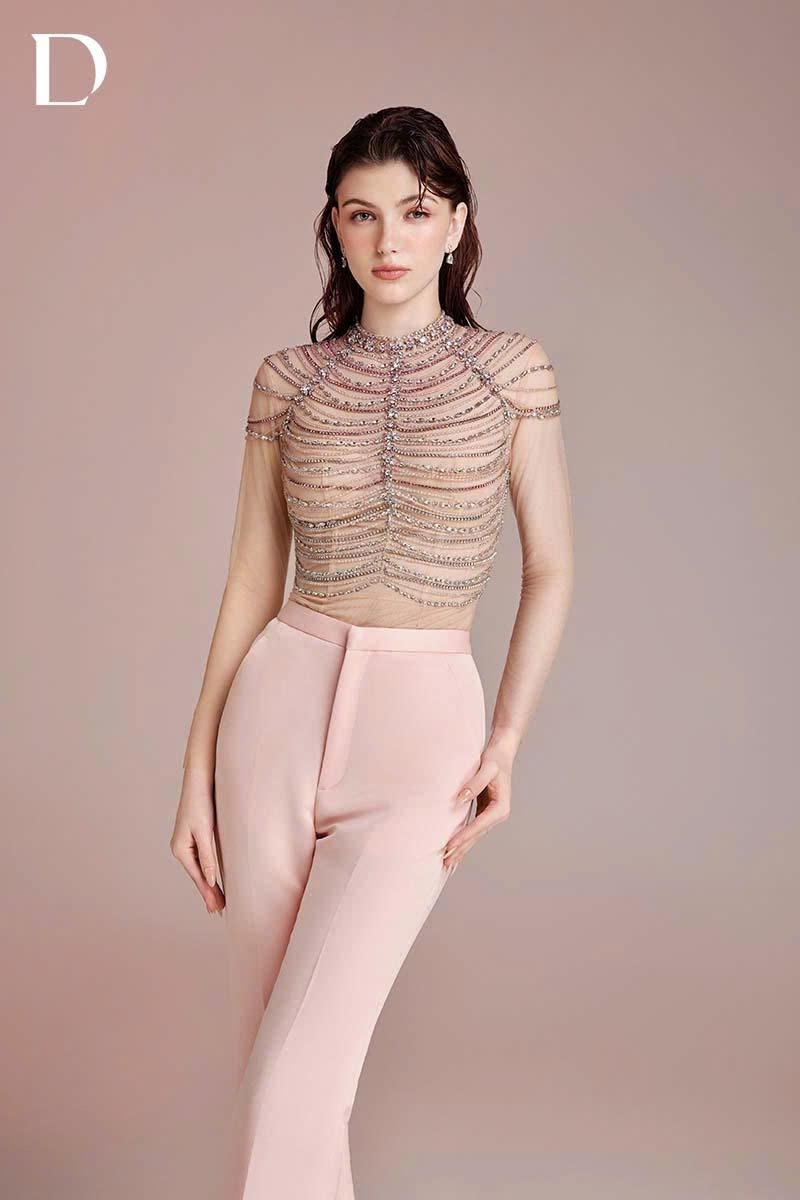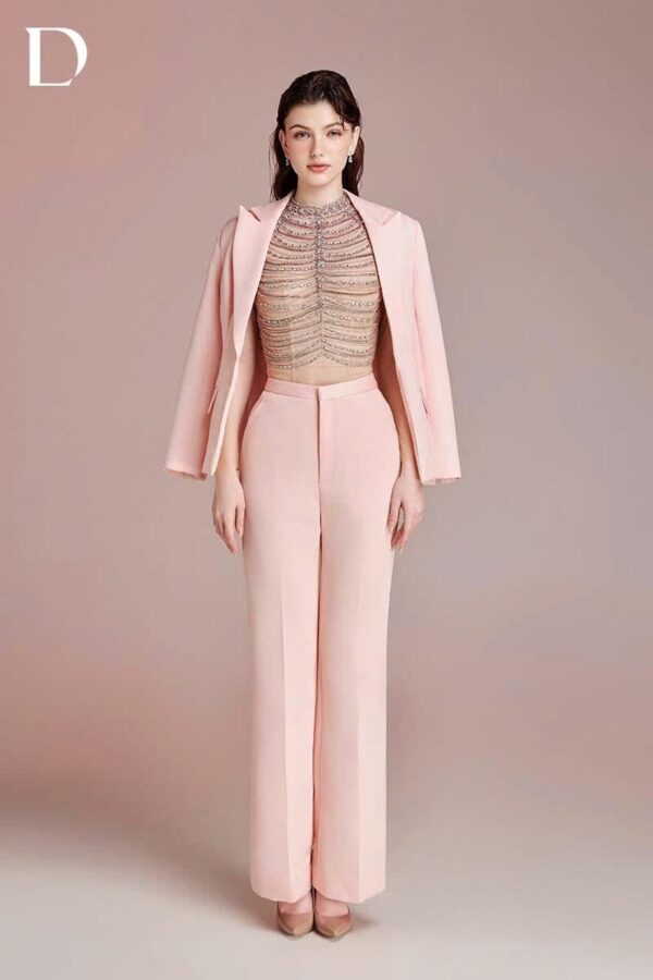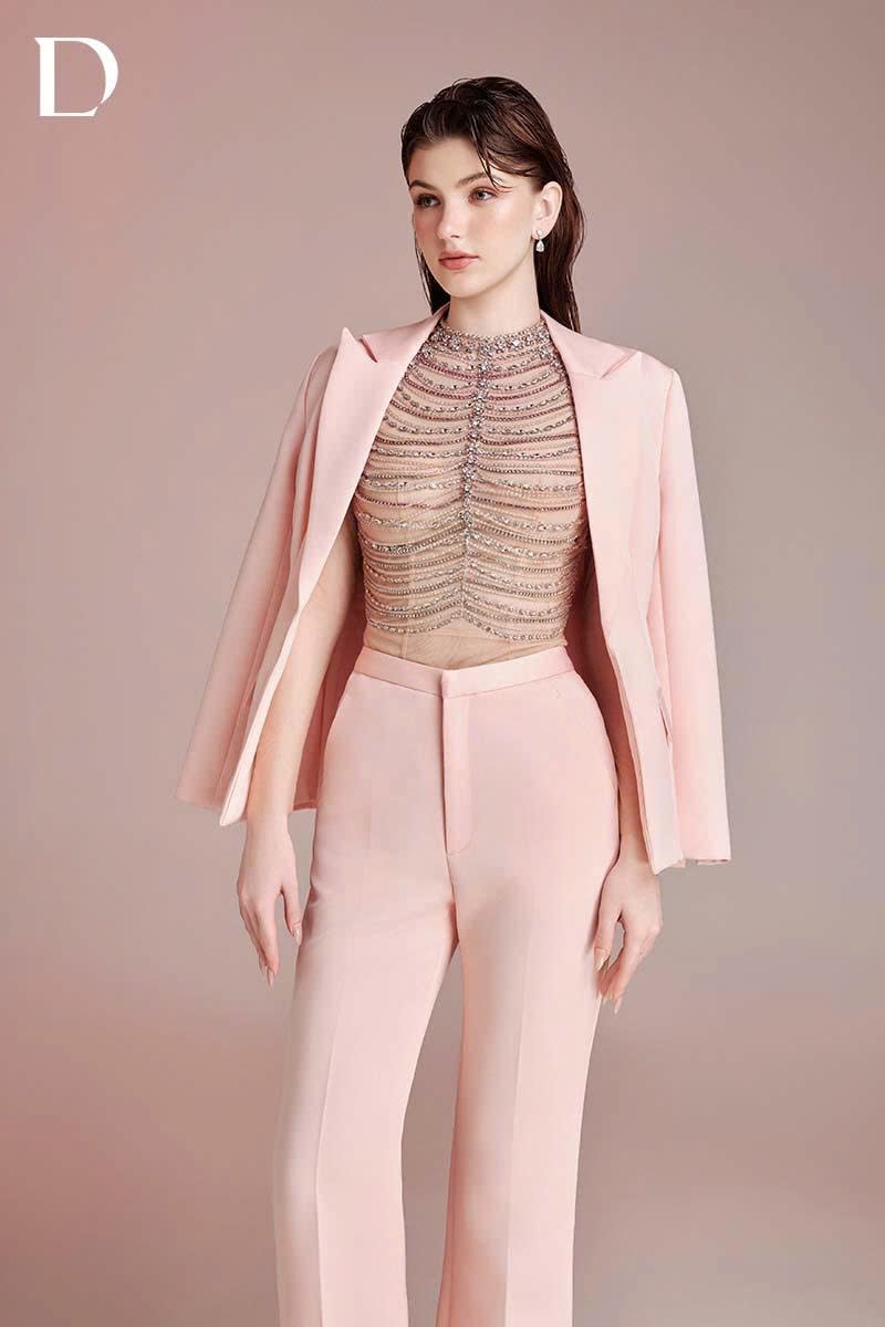 Design combining menswear tailoring and embellishment techniques. A blush pink tone is applied throughout. The bodice features hanging embellishment details applied over a tailored structure.