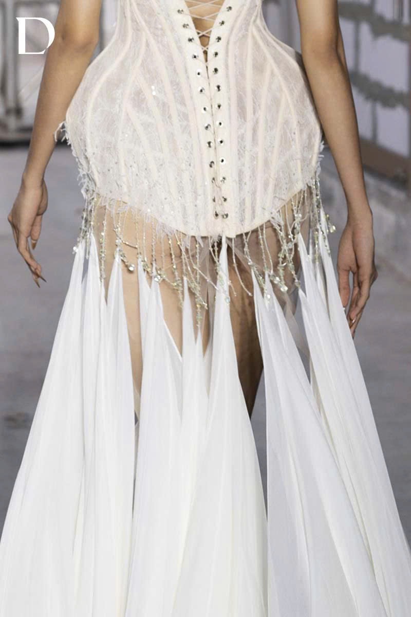 The design blends lace and chiffon, exploring softness while maintaining defined structure. The corseted bodice is sculpted in 3D at the hips, creating a sharp, modern volumetric silhouette. Across the surface, finely crafted crystal embellishments are layered with cascading fabric panels, resulting in fluid movement and a captivating visual rhythm.