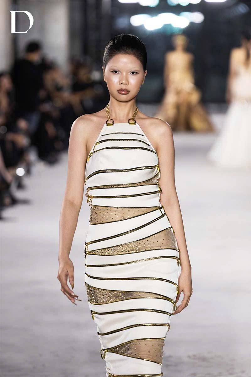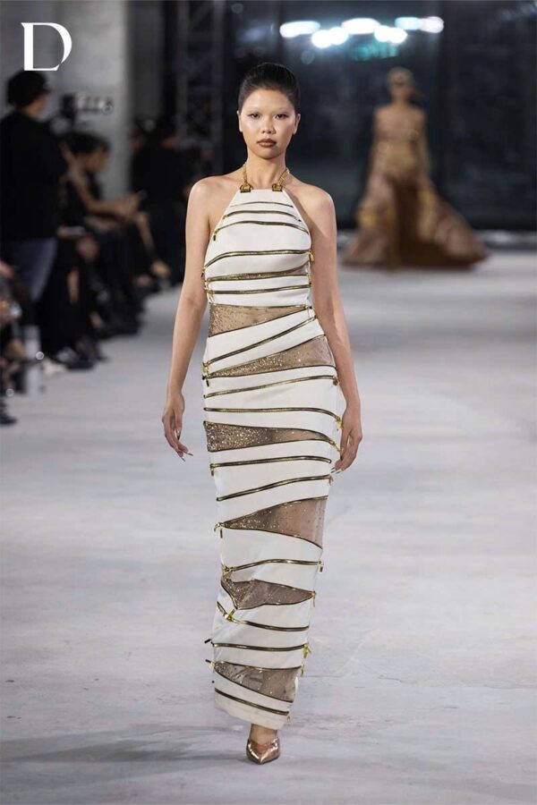 The Ribbon Gown in beige is crafted from taffeta, conveying a modern presence with layered depth. The silhouette features a cut-out extending from the underbust downward, introducing a bold opening while maintaining refinement through precise, clean lines. Across the surface, zipper details combined with crystal embellishment are arranged like ribbon bands, generating luminous effects and a strong visual rhythm in motion.