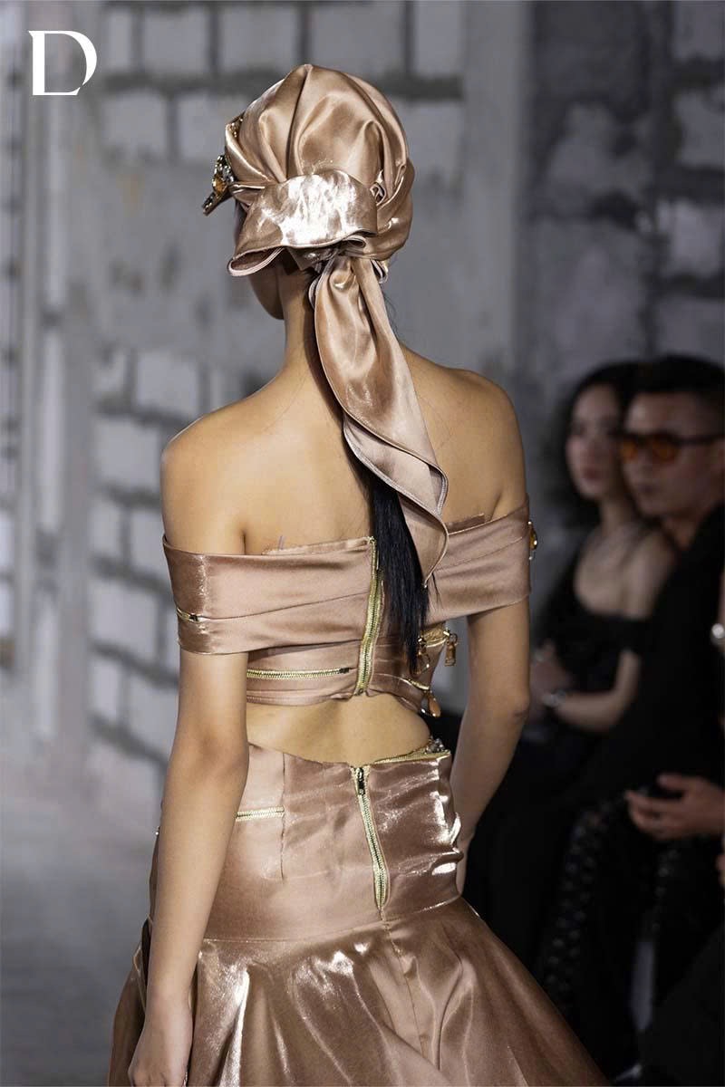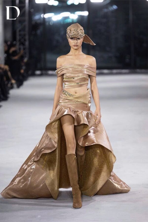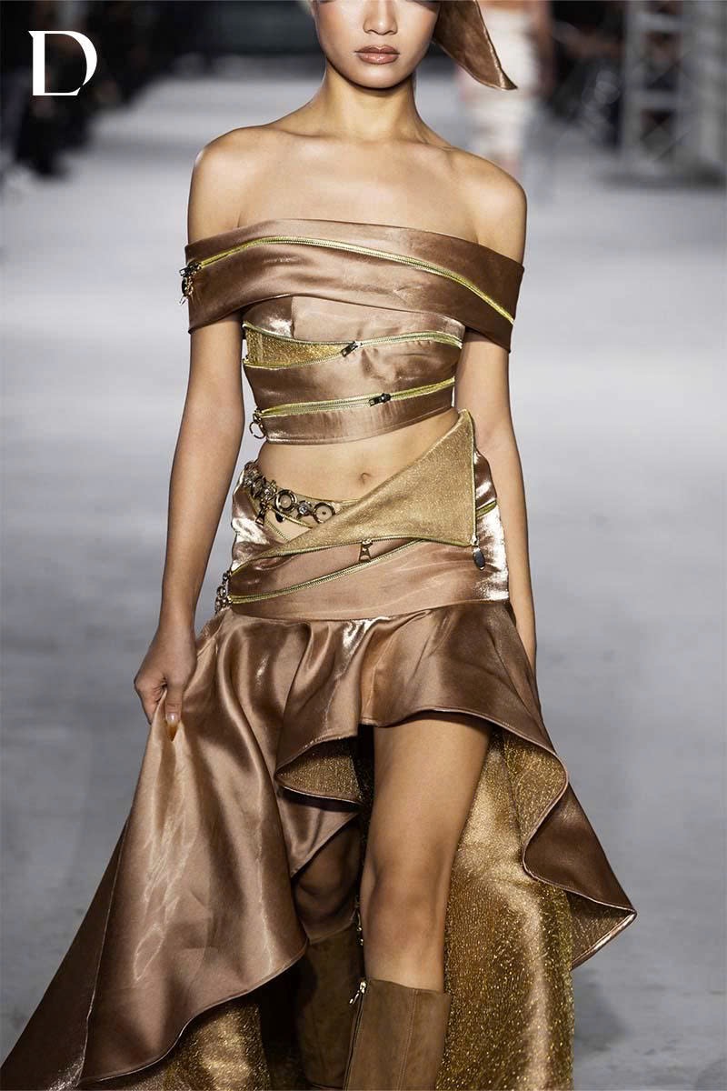 The tortilla brown design conveys a strong, modern attitude. Metallic taffeta combined with shimmering silk creates a refined reflective surface. A mullet silhouette with a luminous lining enhances clarity of movement. The strapless top features horizontal shoulder bands with zipper detailing, forming a decisive structure finished with metal hardware accents.