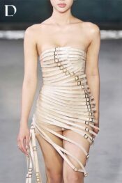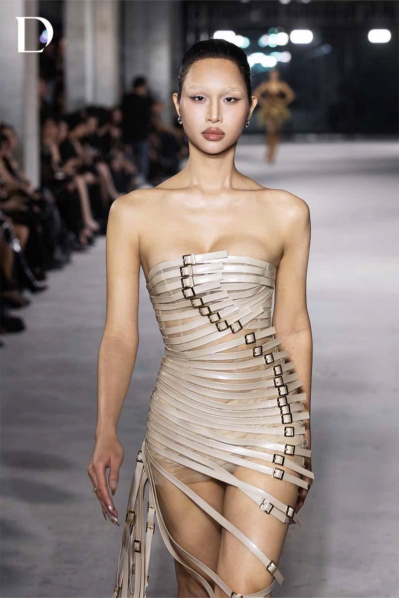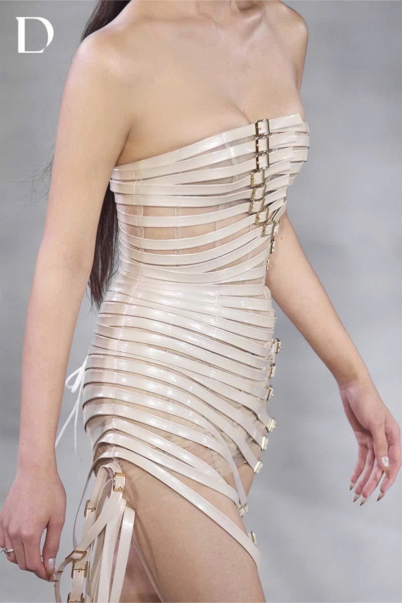 The Strap Dress in beige explores a strong, modern aesthetic. Crafted from faux leather combined with a mesh framework, the entire surface is detailed with leather straps and belt-buckle hardware, creating a sharp and assertive structure. Vertical strap lines elongate the silhouette while delivering a refined visual effect.