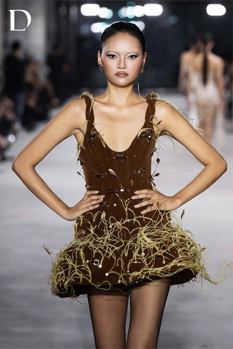 The brunette brown design conveys a modern, subdued tone. Combining velvet and feathers, the look establishes a contrast between softness and strength. The mini dress is sharply structured, accented with metal hardware and feather details, resulting in a bold and character-driven silhouette.