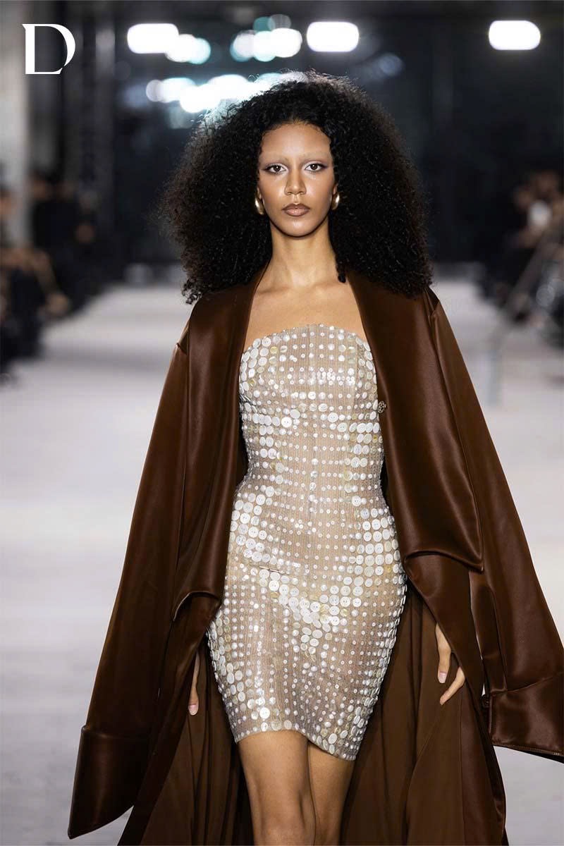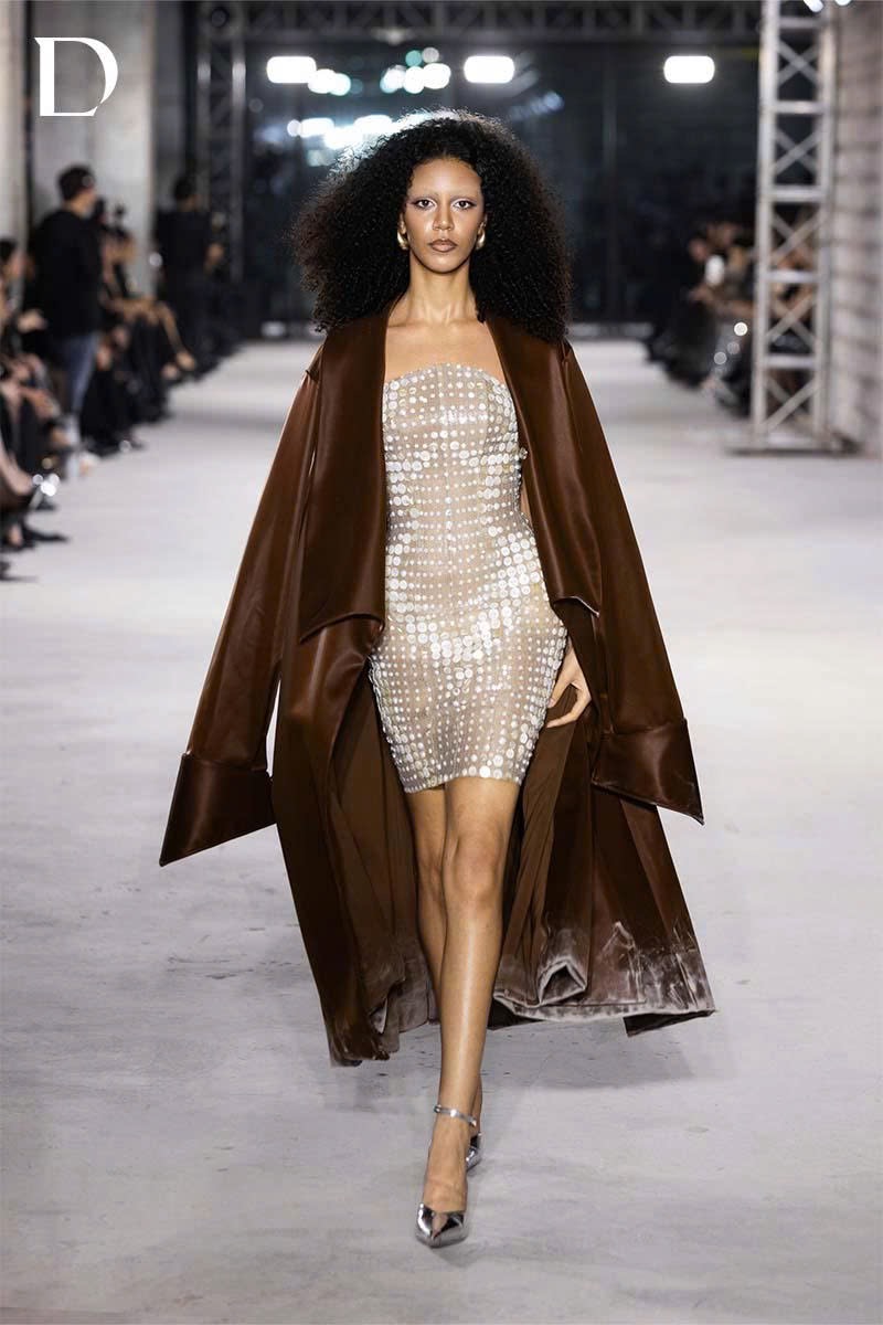 The chocolate brown design carries a deep, powerful tone. Combining faux leather with sheer mesh, the look establishes a contrast between strong structure and soft transparency. The mesh dress is shaped with mother-of-pearl buttons that contour the body, enhancing curves and creating a distinctive visual effect. A wide-cut leather coat completes the ensemble, delivering a sense of freedom and the cool, sharp attitude characteristic of EMERGE.