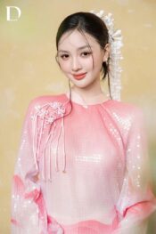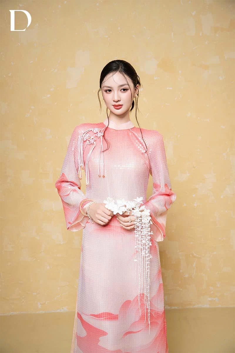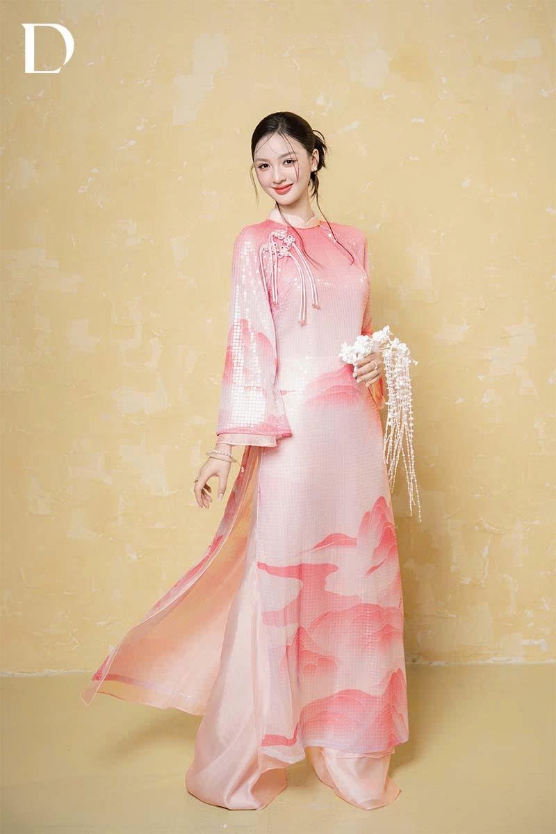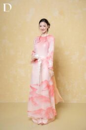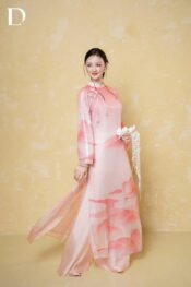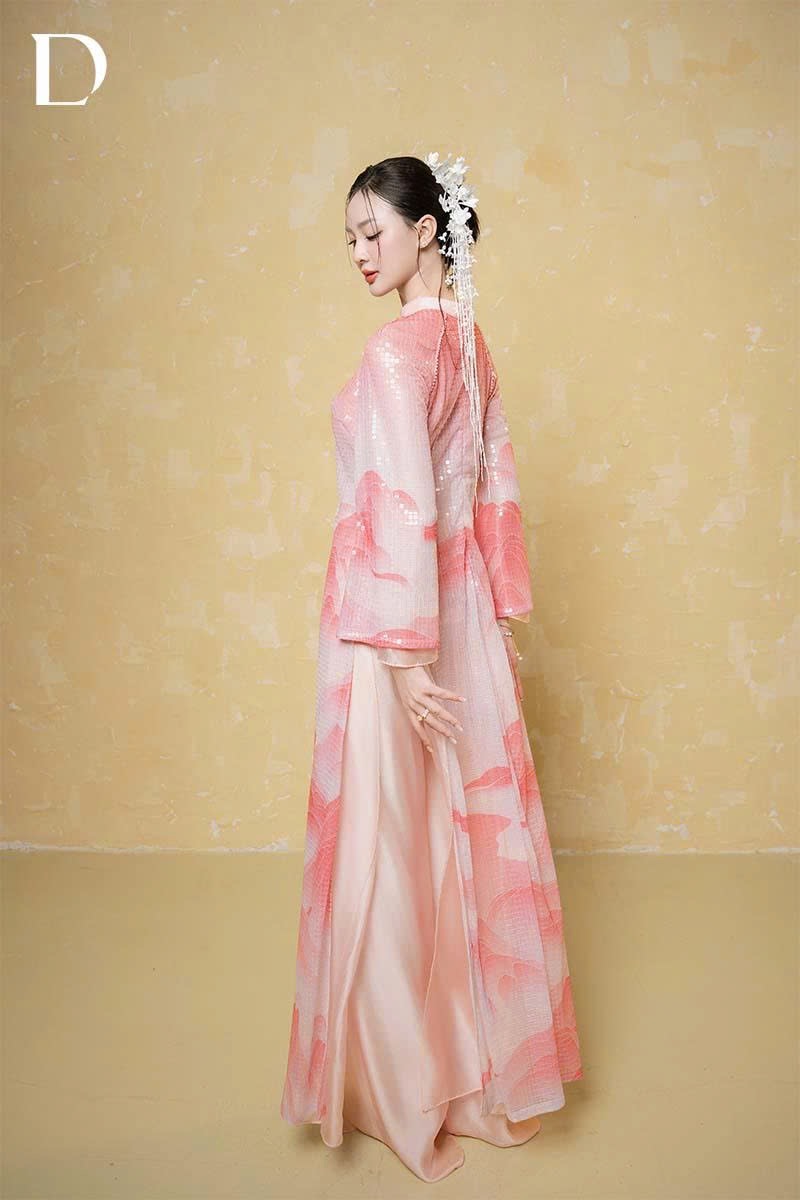 Mary’s Rose and Pink Lemonade tones are treated on a base of printed crystal fabric combined with metallic silk, creating a light-catching effect and surface depth. Stylized mountain motifs are arranged along the length of the garment, shaping visual composition and rhythm. The design reinterprets Vietnamese natural landscapes through color and material, reflecting a spring-inspired spirit.