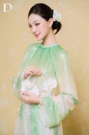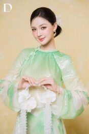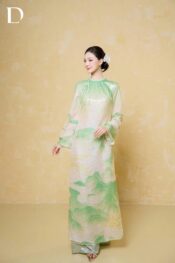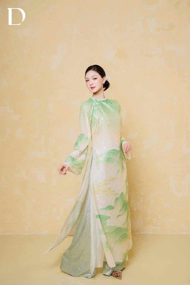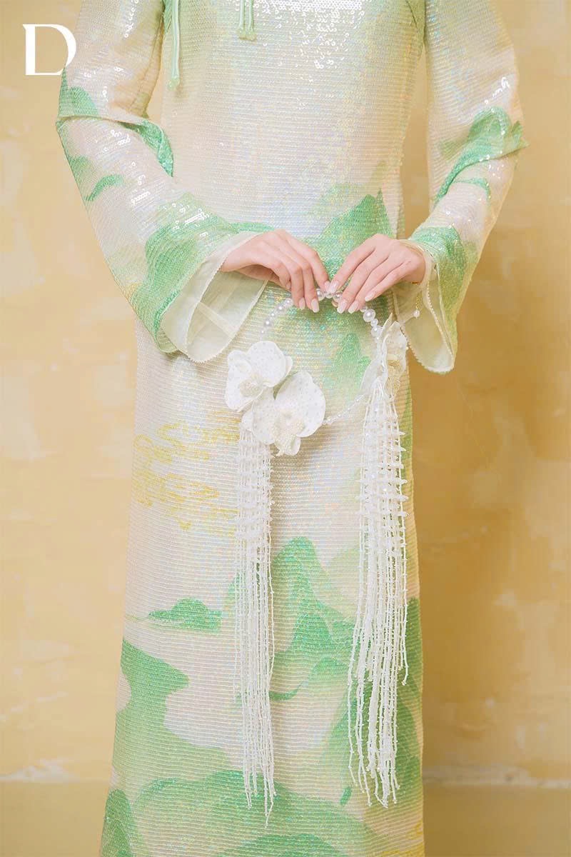 Misty Jade and Meringue tones are applied on printed crystal fabric, silk, and metallic silk. Stylized mountain motifs are placed across the áo dài silhouette. The design explores elongated panels and fabric drape, presenting the áo dài through a contemporary design language.