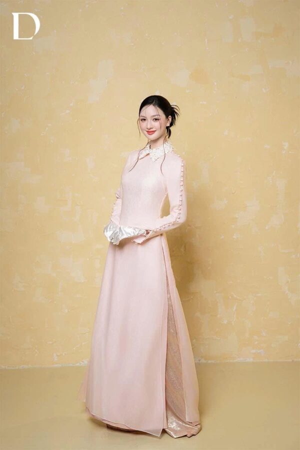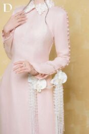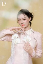 Gam màu White và Petal Pink được xử lý trên nền tafta lụa kết hợp organza nhũ và tơ, tạo hiệu ứng bề mặt và chiều sâu. Họa tiết hoa cỏ được bố trí trải đều trên phom dáng áo dài, định hình nhịp điệu thị giác theo chuyển động. Thiết kế khai thác hình ảnh hoa xuân thông qua chất liệu và kỹ thuật xử lý trong ngôn ngữ đương đại.