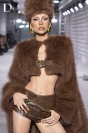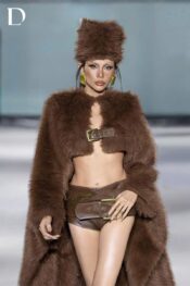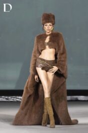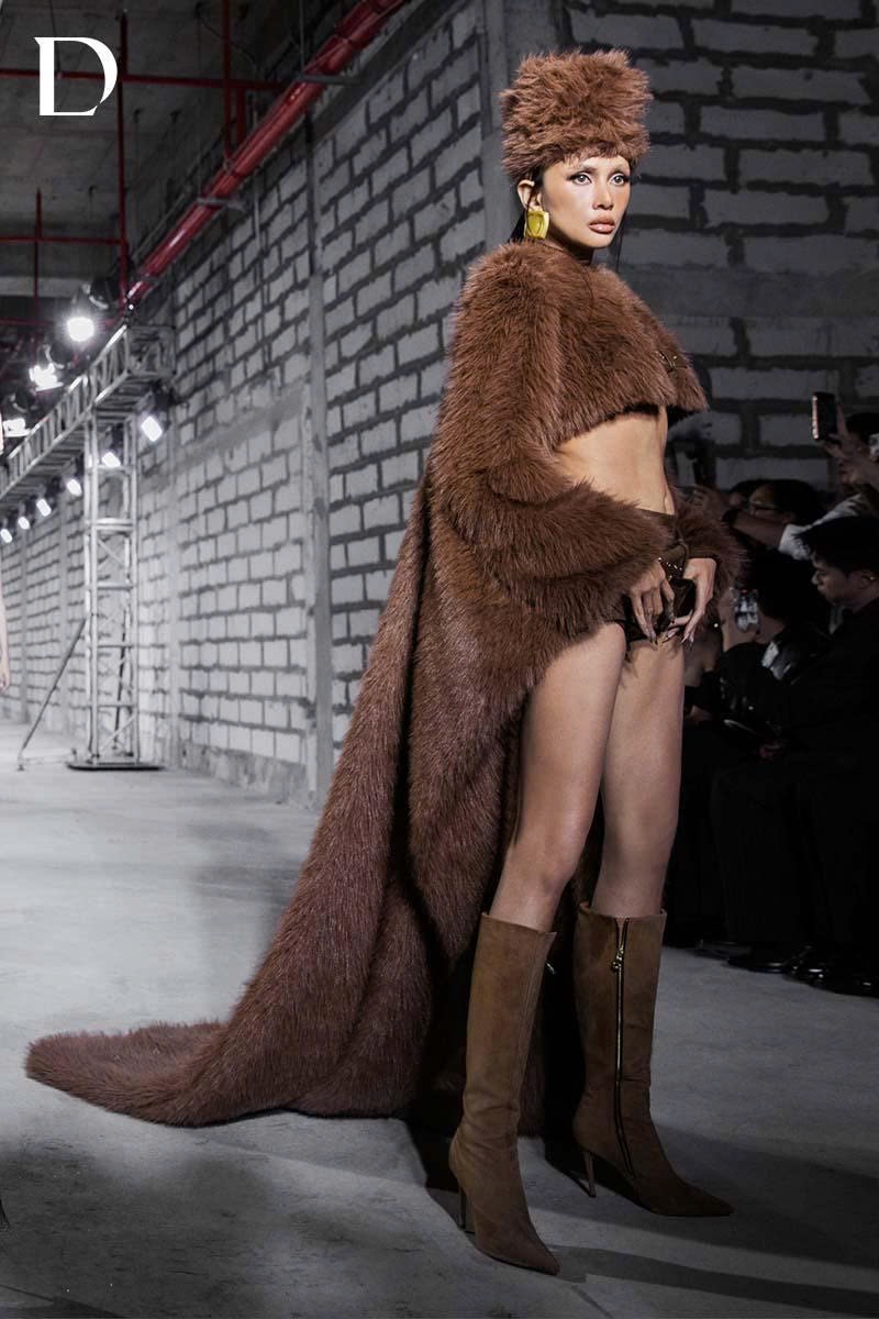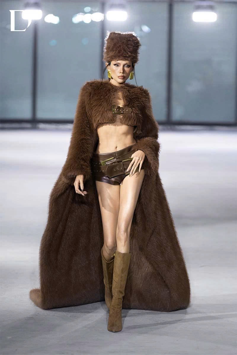 Bộ trang phục all-fur oversized kết hợp cùng mũ lông đồng bộ mang đến cảm giác hoang dã nhưng vẫn giữ tinh thần sang trọng. Phom áo khoác oversized được xử lý có chủ đích, tạo chuyển động dứt khoát theo từng bước sải. Quần đi kèm belt bản lớn nhấn rõ vòng eo, hoàn thiện tổng thể gọn gàng, cá tính và chuẩn tinh thần Do Long.