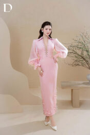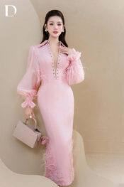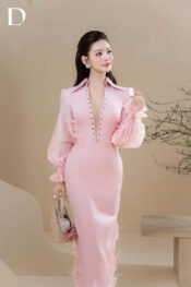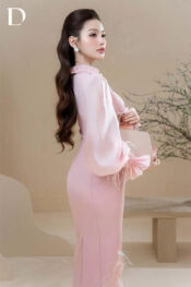 Long dress gam hồng. Phom dáng ôm gọn trên nền cotton, kết hợp tơ và lưới mỏng tạo độ rũ. Chi tiết đắp ren và đính lông được xử lý tại tay áo và gấu váy, hoàn thiện cấu trúc tổng thể.