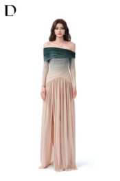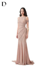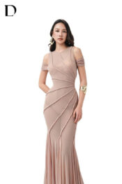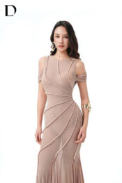 Thiết kế long dress trên nền spandex, gam màu beige. Phom đuôi cá ôm sát, xử lý chi tiết rã thân, kết hợp đính hạt ngọc trai.