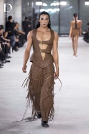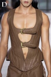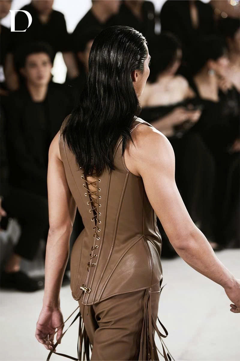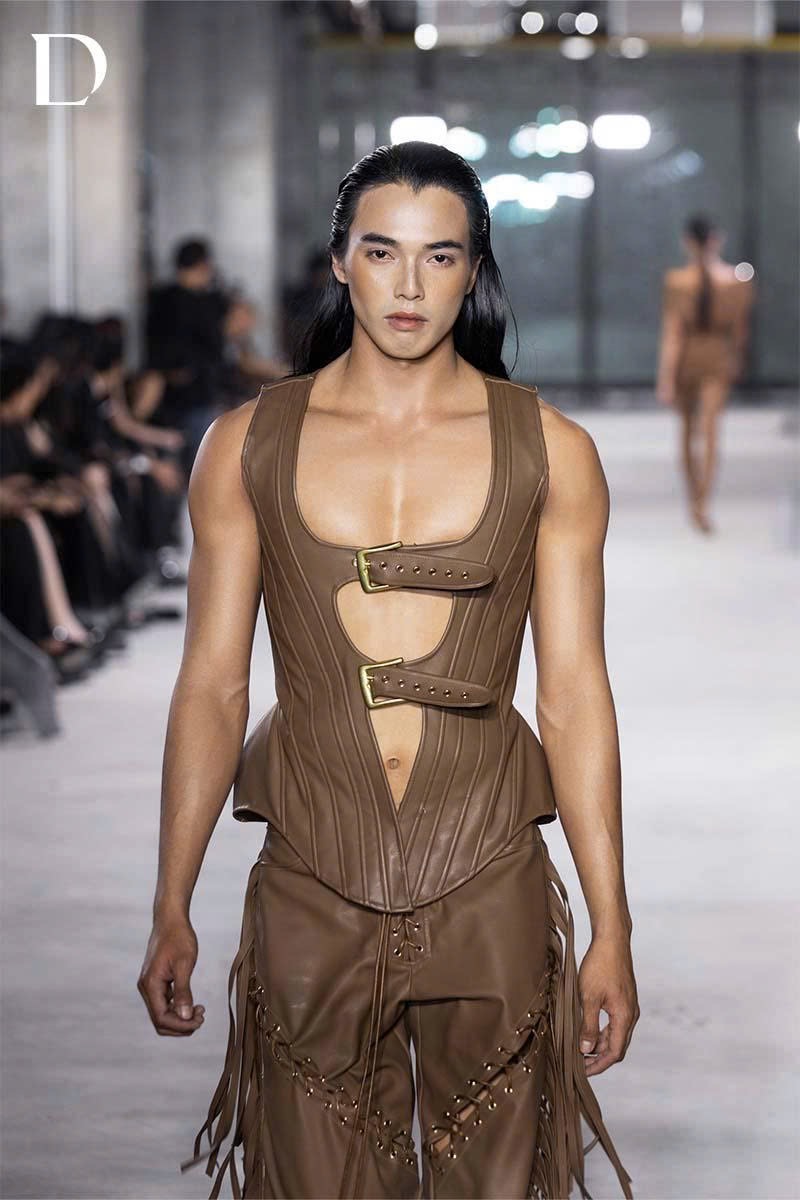Thiết kế màu walnut brown mang sắc thái trầm hiện đại. Trang phục sử dụng chất liệu da cotton, tạo phom dáng đứng và cấu trúc mạnh mẽ. Phần áo corset nam siết eo được nhấn bằng khóa thắt lưng kim loại, làm nổi bật tỷ lệ cơ thể theo hướng cá tính và dứt khoát. Quần được xử lý rã chéo ở ống, đi kèm dây mắc cáo và tua rua hông, mang lại cảm giác độc đáo và giàu chuyển động.