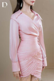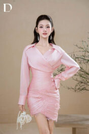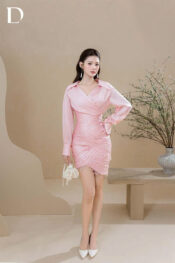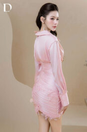 Thiết kế mini tone light pink trên nền tơ xước, phom ôm với chi tiết draping thân váy. Đắp ren và đính kết dọc thân.