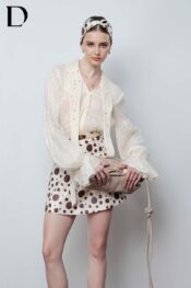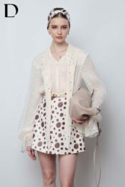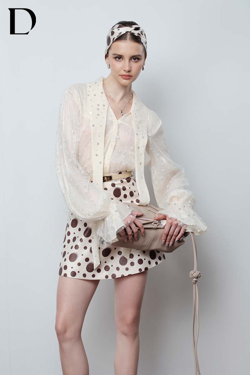 Thiết kế với phom váy chữ A ngắn từ chất liệu poly-cotton gam kem chấm bi nâu phối áo voan tơ cổ nơ dài và tay phồng đính kim sa.