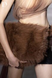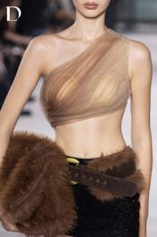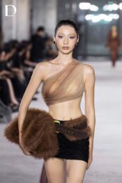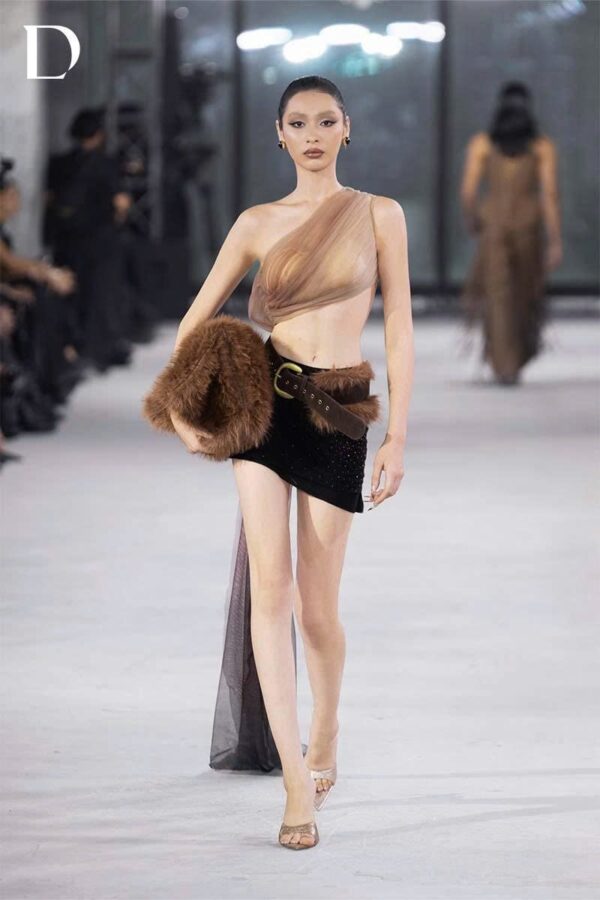 Thiết kế Primal Ashes sử dụng bảng màu brown – black, gợi sắc thái chuyển hóa mạnh mẽ. Trang phục được phát triển trên nền lưới và thun, giữ cảm giác nhẹ nhưng cấu trúc rõ ràng. Áo ngắn xử lý xếp lưới kết hợp in chuyển màu, tạo hiệu ứng khói tro đặc trưng của EMERGE. Chân váy ngắn đồng bộ phối thắt lưng đính lông, tạo điểm nhấn tương phản giữa mềm mại và sắc nét.