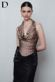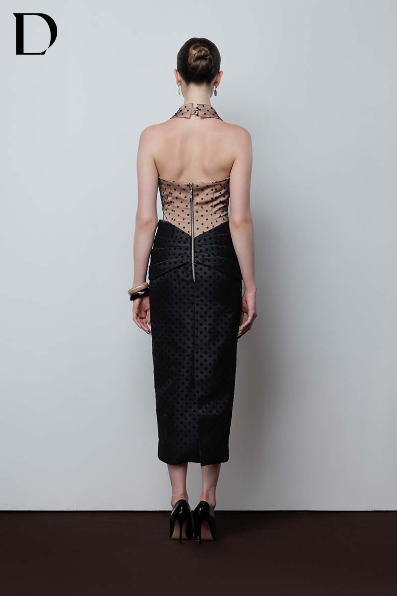 Chất liệu tafta ánh kim kết hợp lụa phủ lưới chấm bi.