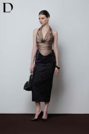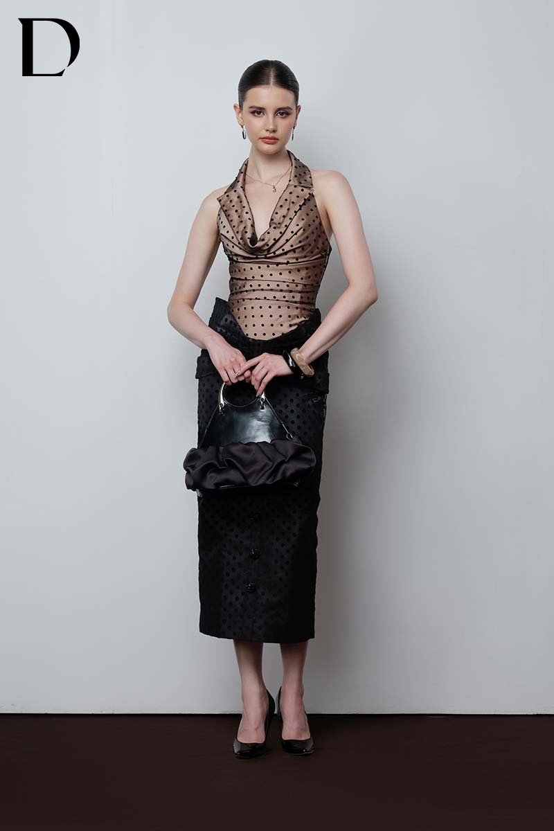 Áo cổ đổ cách điệu màu beige phối chân váy midi đen draping nơ bản lớn.