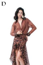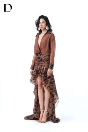 Thiết kế set midi dress trên nền chiffon, gam màu brown print. Phom váy mullet in hoạ tiết báo đốm, kết hợp áo sơ mi form phóng khoáng.