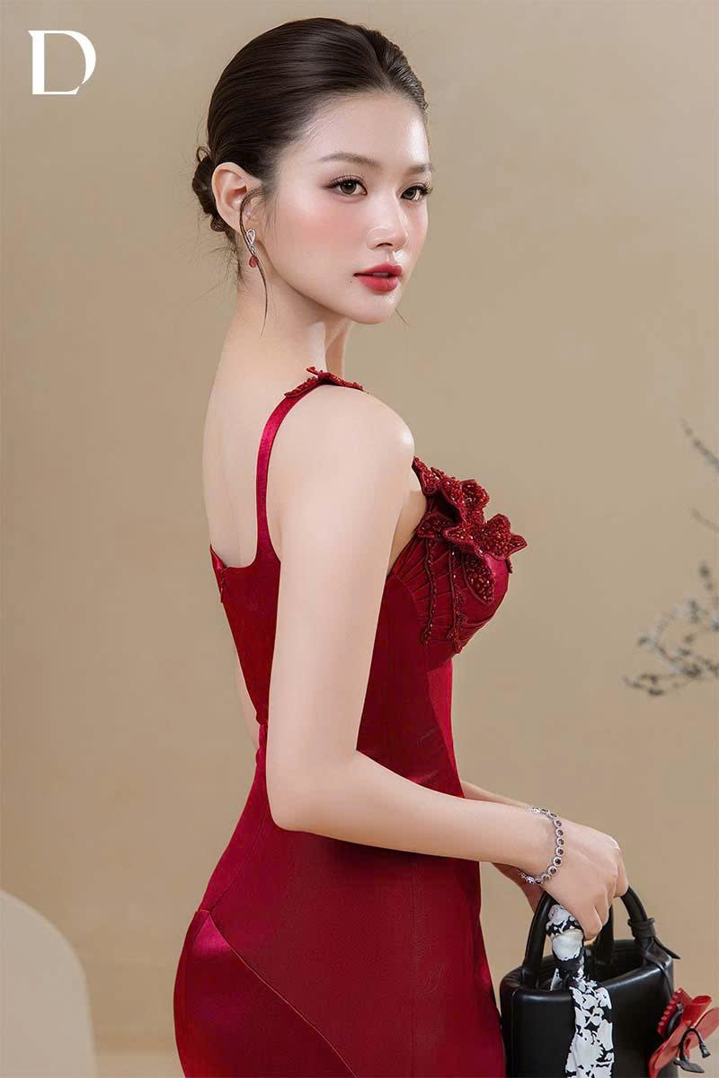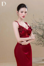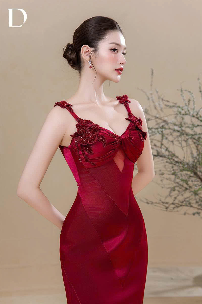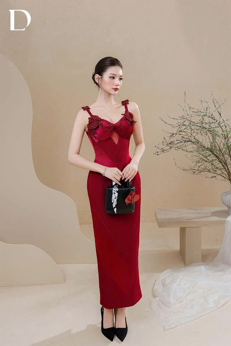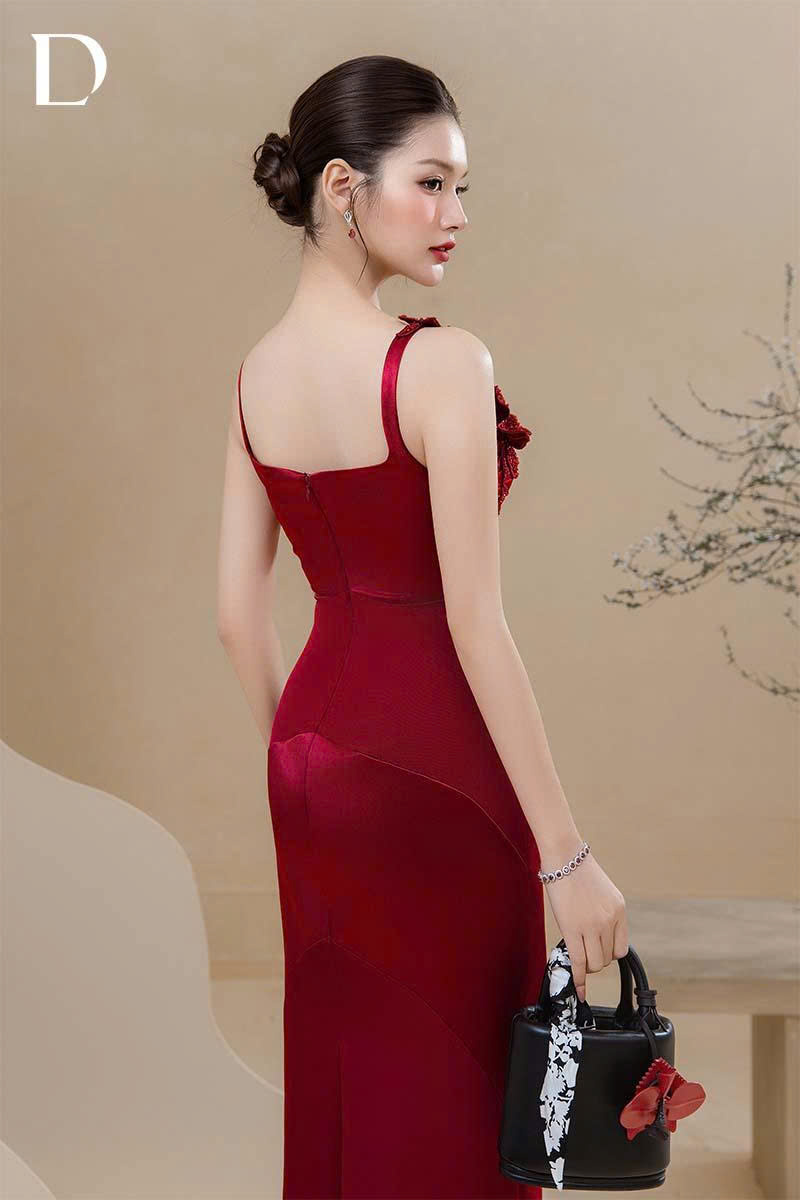 Long dress gam wine red, kết hợp silk cotton và lụa nhung gãy.