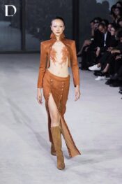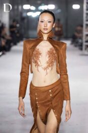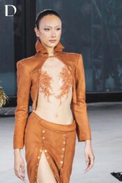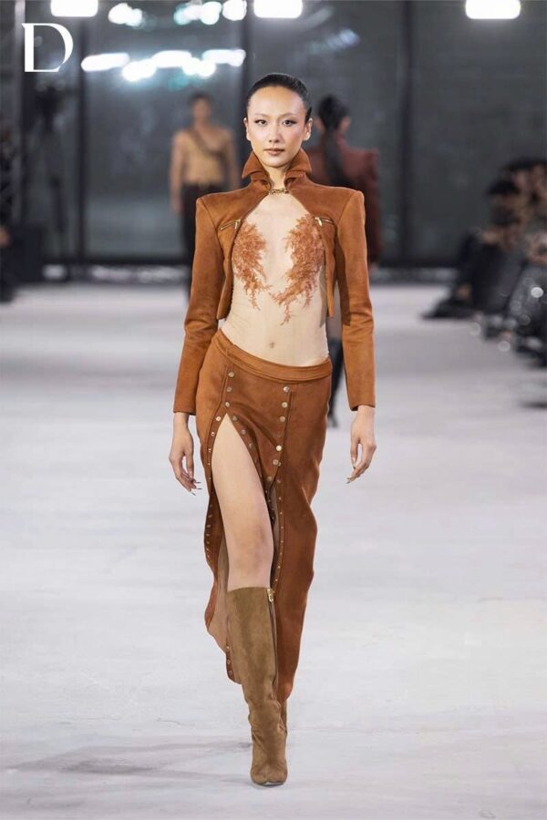 Sienna Set mang sắc cowhide brown, thể hiện tinh thần mạnh mẽ và hiện đại. Sự kết hợp giữa da lộn, ren và lưới tạo nên bề mặt chất liệu giàu chiều sâu. Áo khoác dáng ngắn phom gọn phối lớp lưới đắp ren, cân bằng giữa độ mềm và cấu trúc sắc nét. Chân váy dài xẻ hai bên, hoàn thiện bằng chi tiết nút đồng, tăng chuyển động và điểm nhấn kim loại.