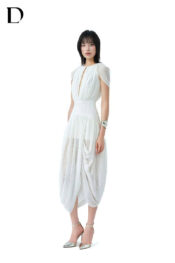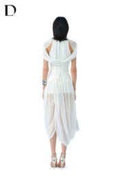 Thiết kế midi dress trên nền spandex cotton, gam màu white. Phom ôm, xử lý draping, cổ xẻ sâu.
