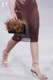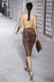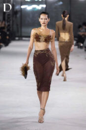 Thiết kế gam dark brown. Trang phục sử dụng lưới thun, lông, vải tơ và ren, tạo bề mặt đa lớp đặc trưng của Do Long. Phần top xuyên thấu được xử lý bằng sợi tơ cắt mô phỏng lông vũ, tạo chuyển động khi di chuyển. Bên dưới, váy lưới kết hợp ren, hoàn thiện tổng thể với sự tương phản về chất liệu và cấu trúc.