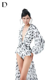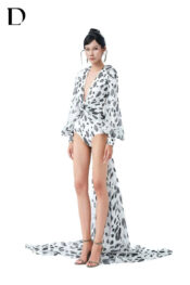Thiết kế bodysuit trên nền chiffon, gam màu white print. Phom ôm sát, hở lưng đan dây, tay phồng, phát triển hoạ tiết kết hợp đính kết nhẹ.
